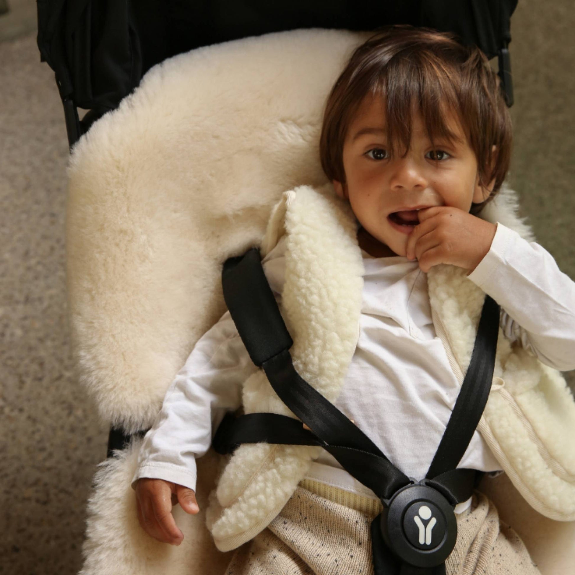 The Sheepskin Snuggler is crafted from deep-pile merino sheepskin, creating the softest, most inviting cocoon. Pre-cut harness slots and a Velcro backing ensure secure attachment to your buggy. Once you're back at home, the Snuggler easily detaches, ready to provide even more comfort placed in a bouncer, on a chair, or as an ultra cosy floor layer.