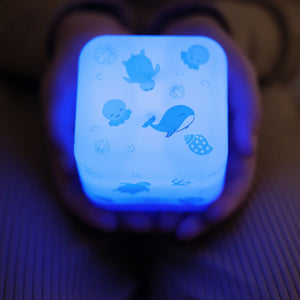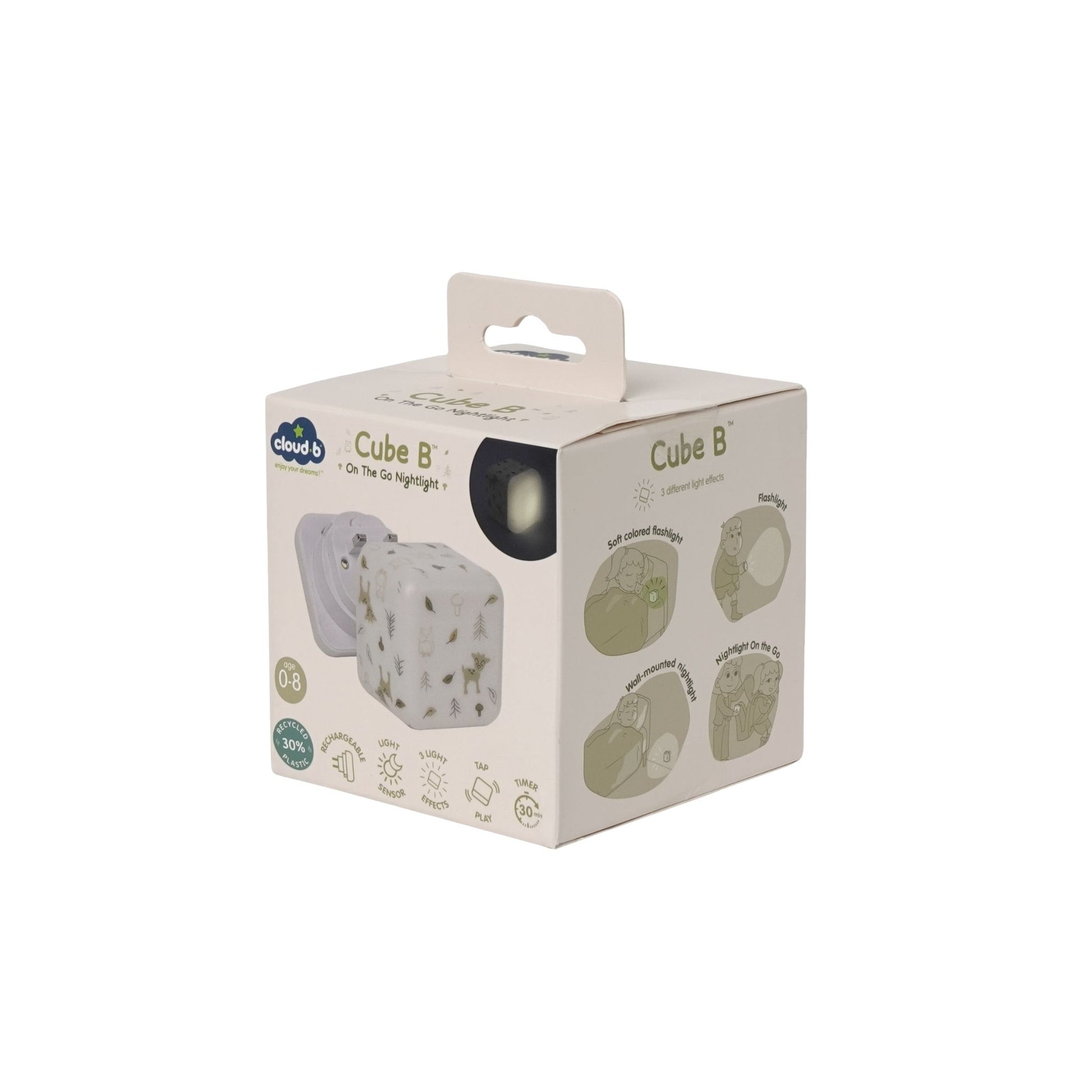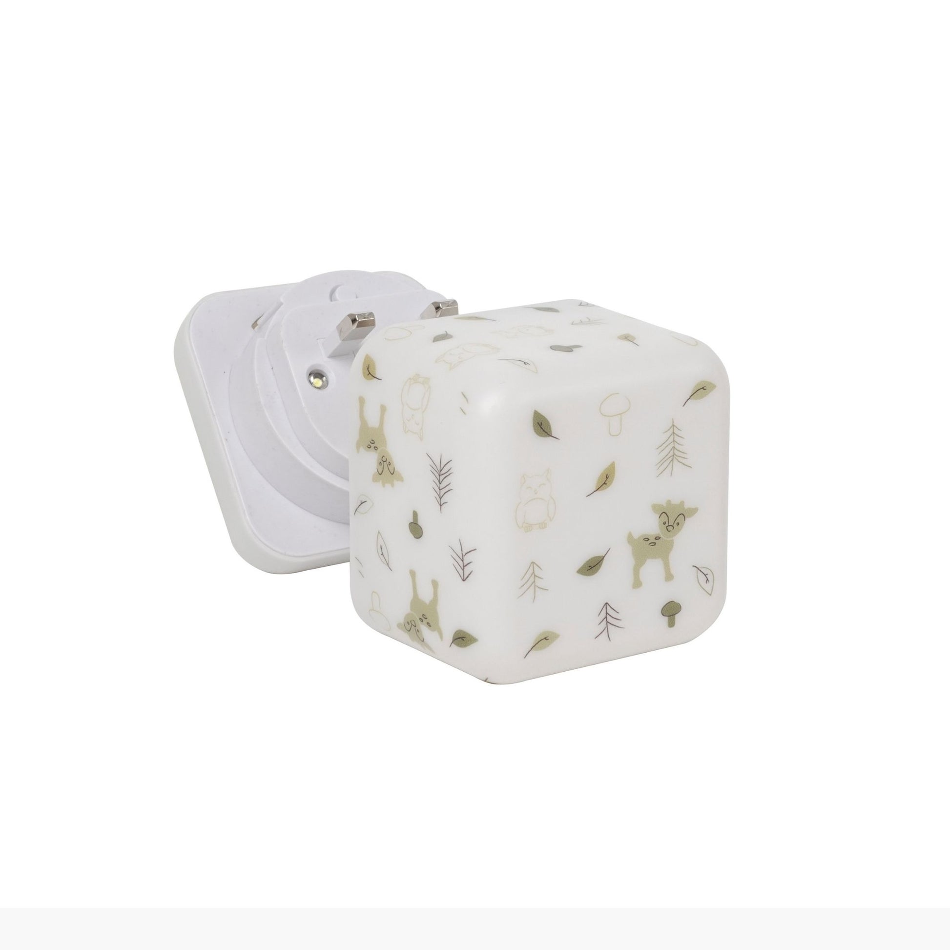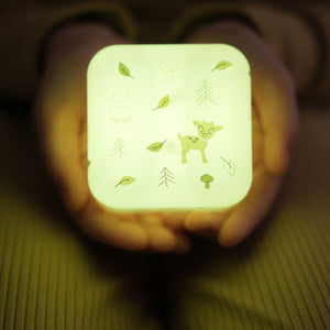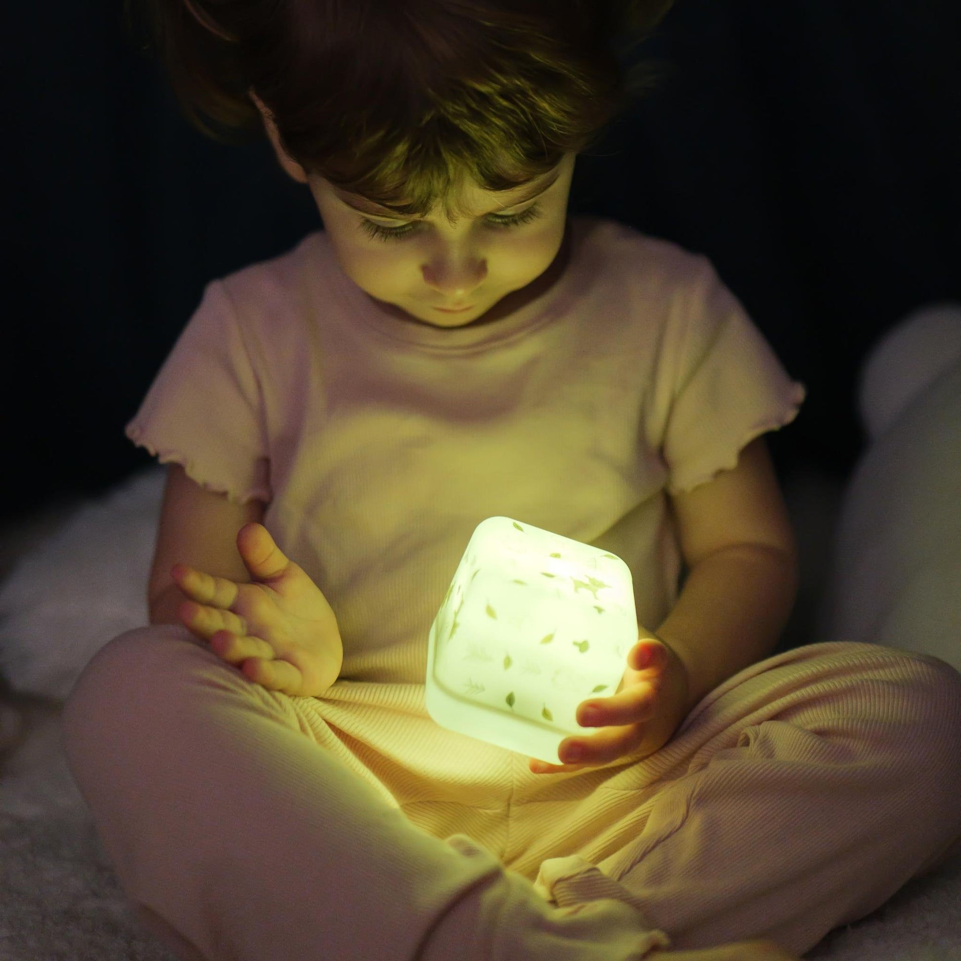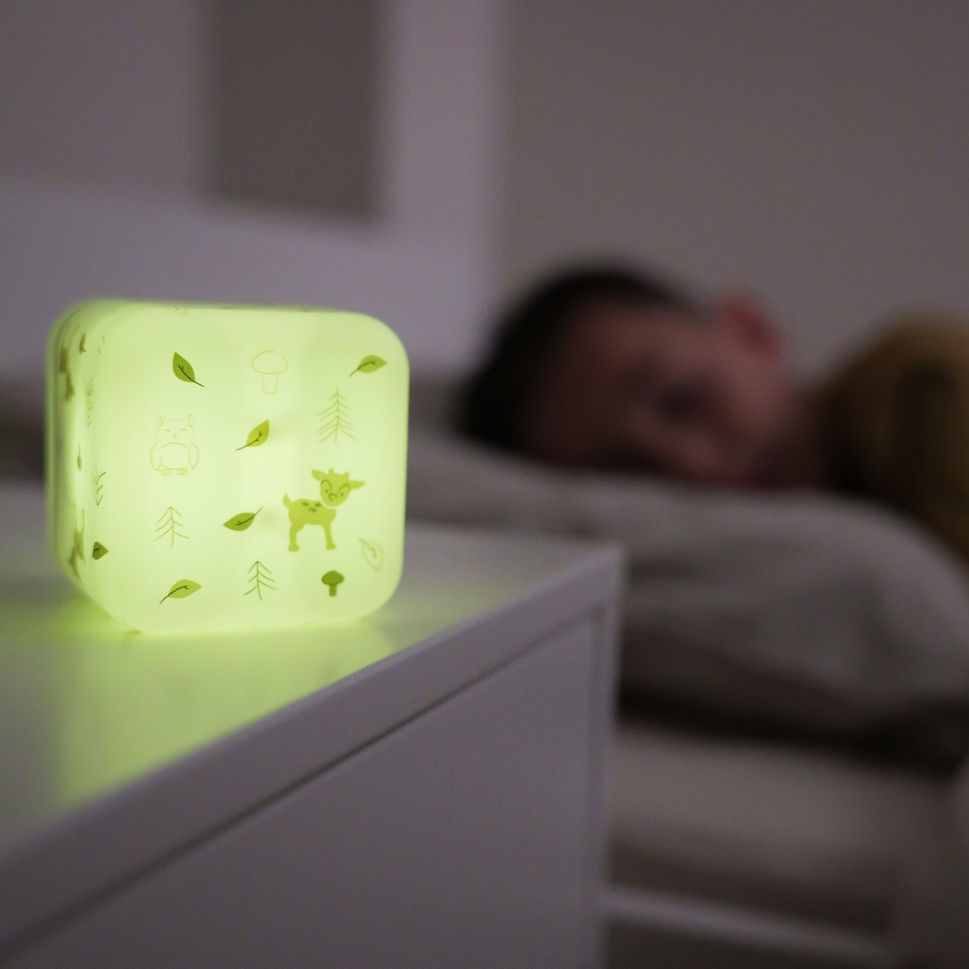 Bring a woodland calm to bedtime with this compact forest-themed night light from Cloud B. The versatile Cube B is decorated with nature inspired motifs - a friendly fawn, a peaceful owl, leaves, trees and mushrooms, and offers three soothing light variations for different stages of the evening. The intelligently designed base can be removed and plugged into the wall, casting a soft white glow for ambient light.