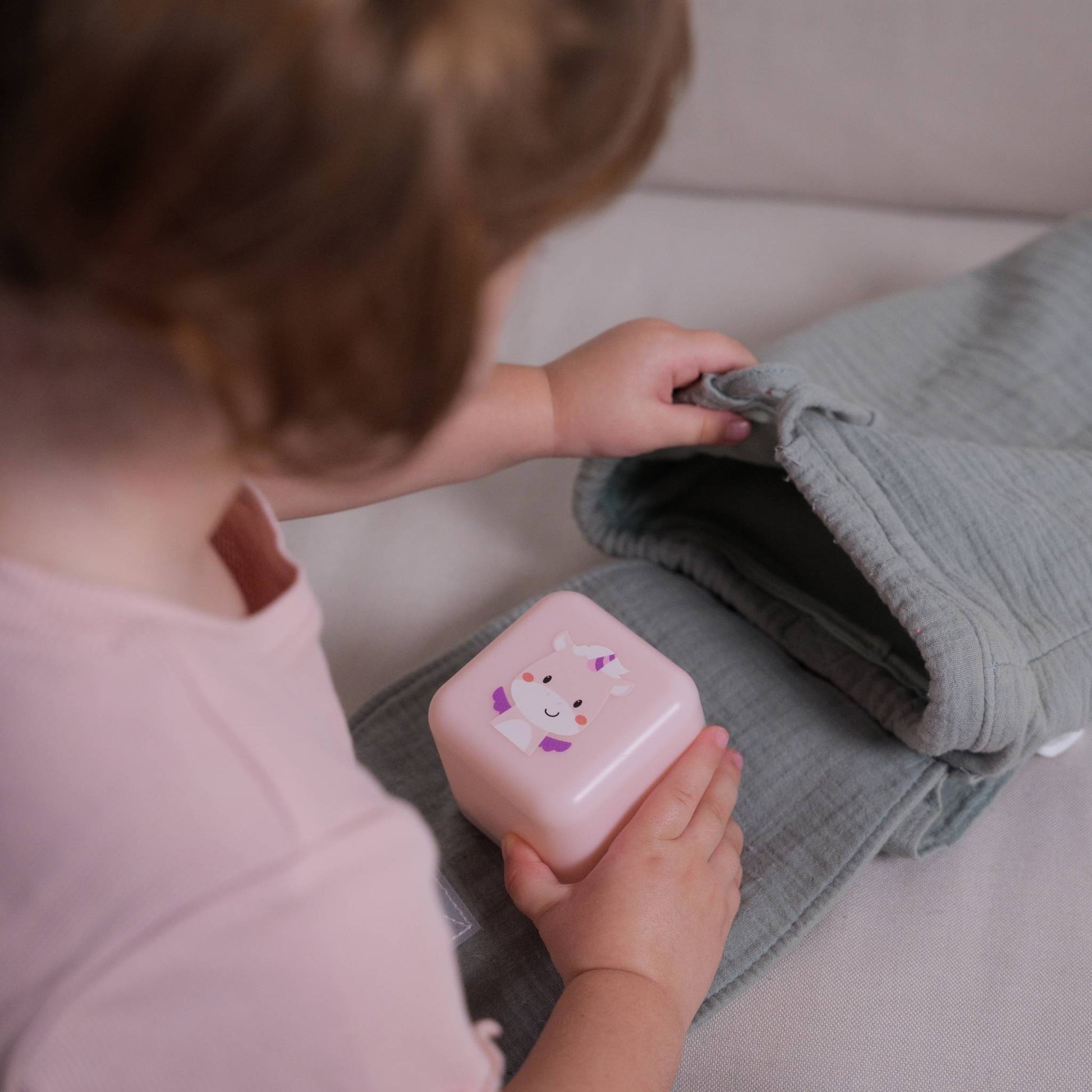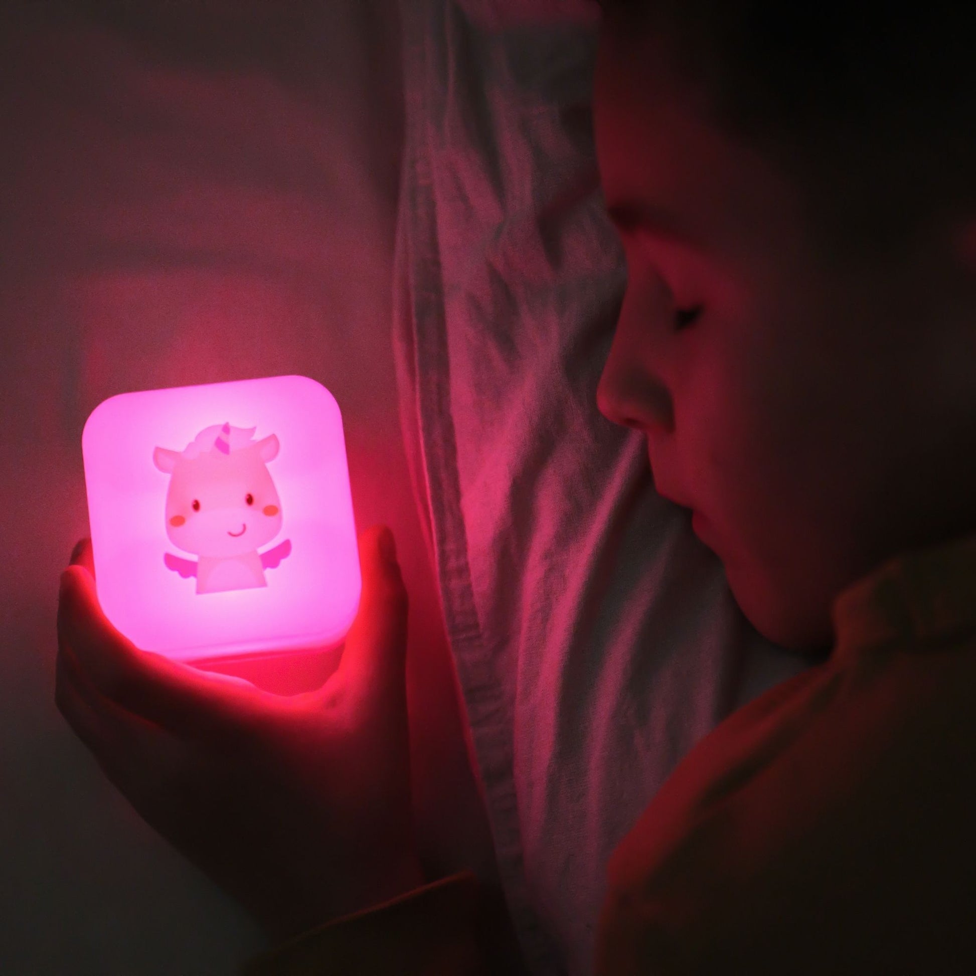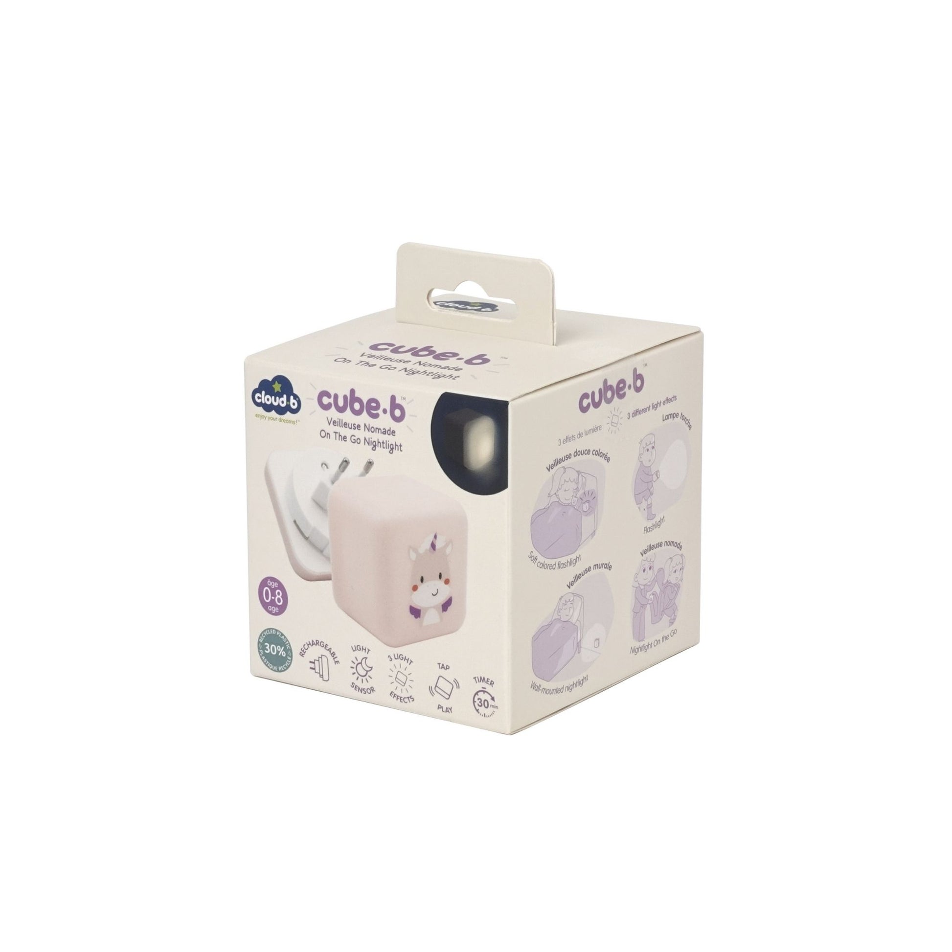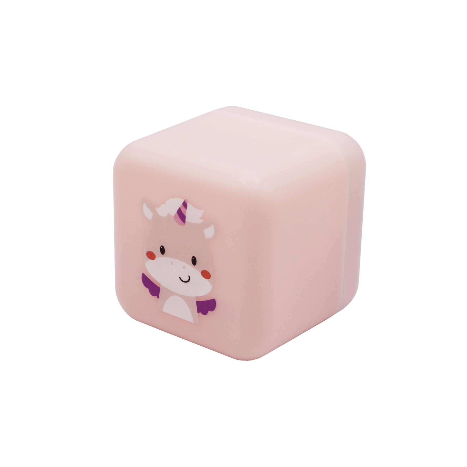 The versatile Cube B features an adorable smiling unicorn, offering three soothing light variations for different stages of the evening. The innovatively designed base can be removed and plugged into the wall, casting a soft white glow for ambient light.