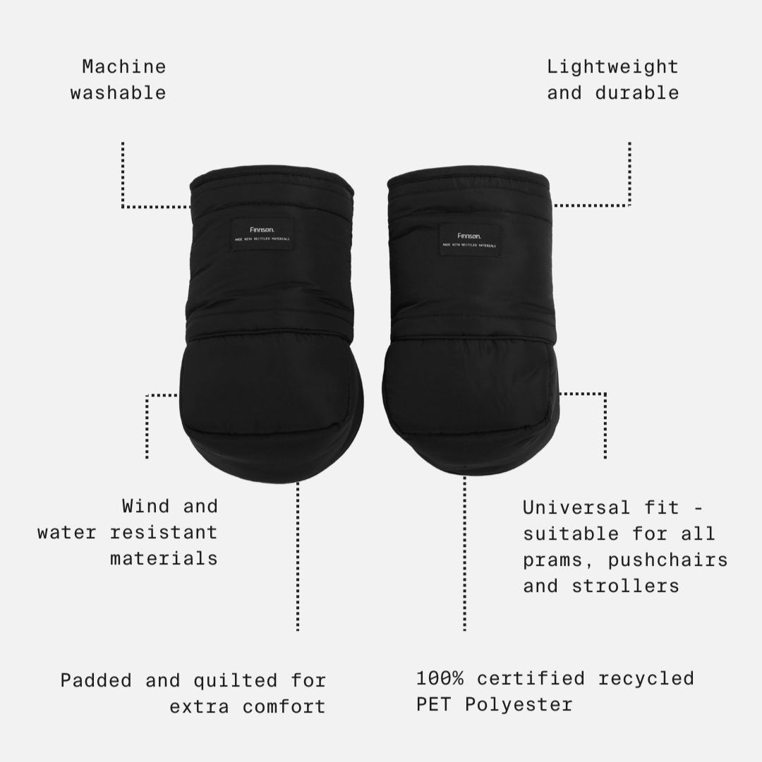 Featuring a soft teddy borg outer layer and a plush recycled teddy fleece lining for superior warmth and comfort. Their clever universal fit and velcro attachment make them easy to secure on any stroller handle so you're always ready to go, no matter what buggy you use.