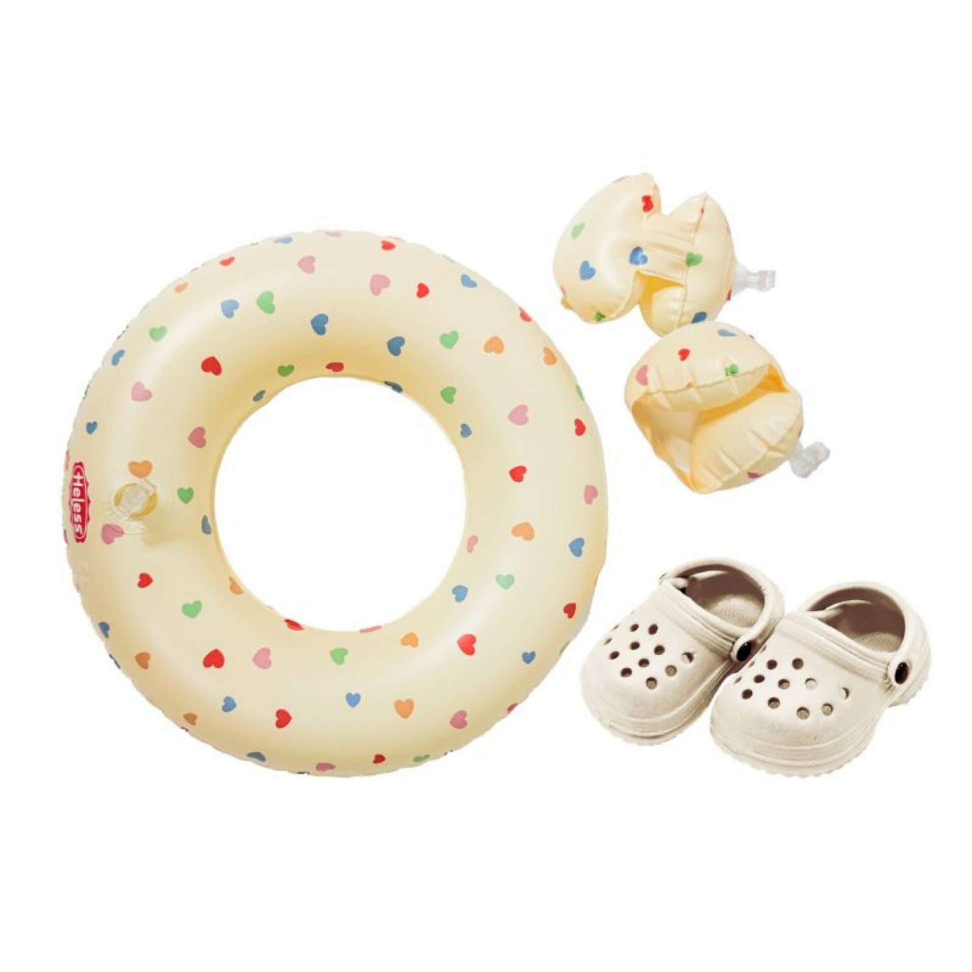 Complete with a swim ring and matching armbands featuring a playful rainbow heart print, this adorable set ensures your doll is ready to make a splash in style. Once the water fun is over, a pair of cream clogs is included so your dolly can dry off and relax in comfort.