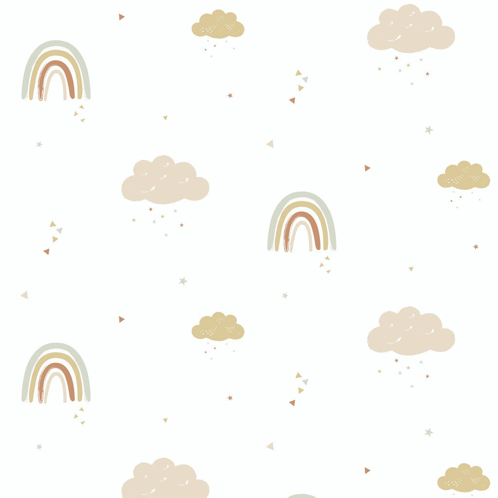 Brighten your little one's nursery, bedroom or playroom with this cheerful Rainbows wallpaper from Hibou Design. A combination of colourful rainbow and cloud motifs dance upon sophisticated shades of mustard, rose, brick and sage green to create an optimistic setting for those early years.
