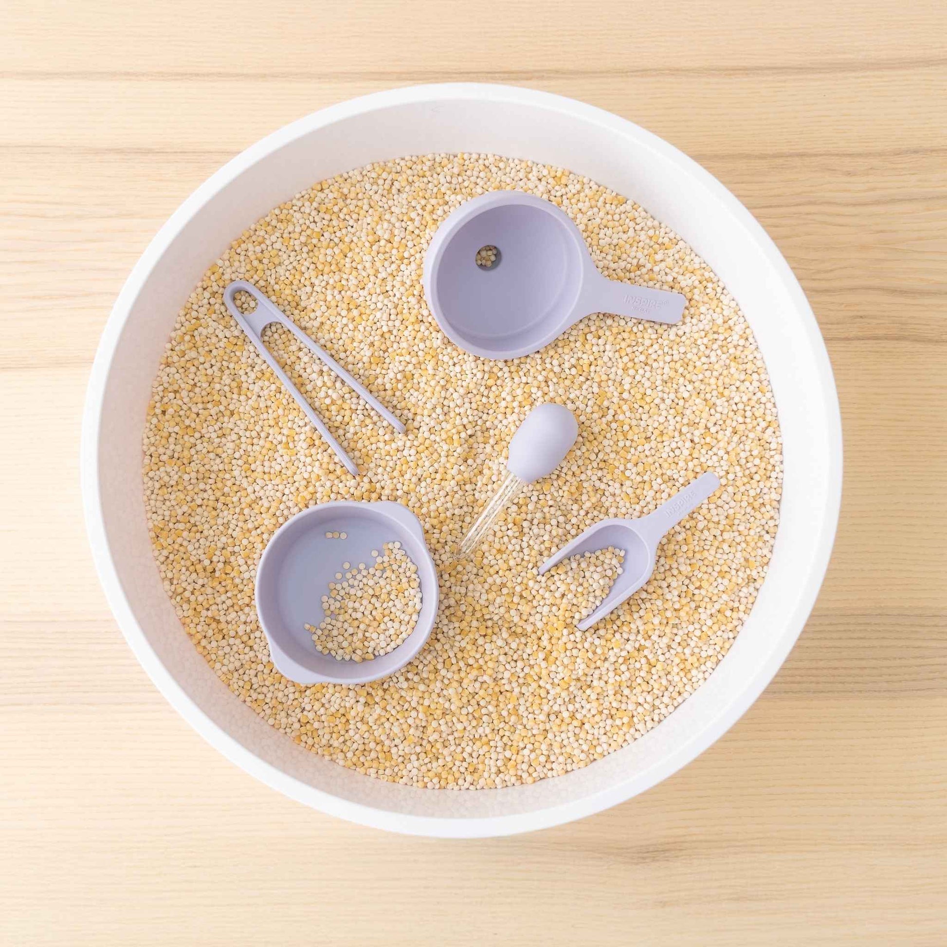 Consisting of a matching lilac bowl, mini scooper, funnel, dropper, a pair of tongs and a handy mesh bag for easy storage once playtime is over, this versatile set opens up endless play possibilities. Crafted from durable silicone, the tools are waterproof and easy to clean, making them ideal for repeated use across a wide variety of activities.