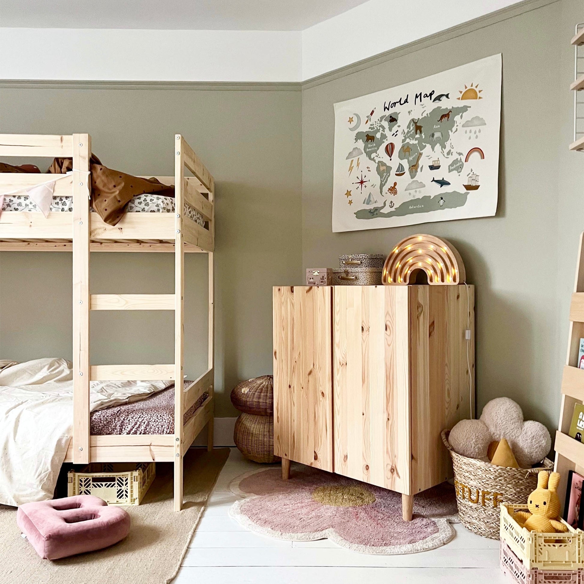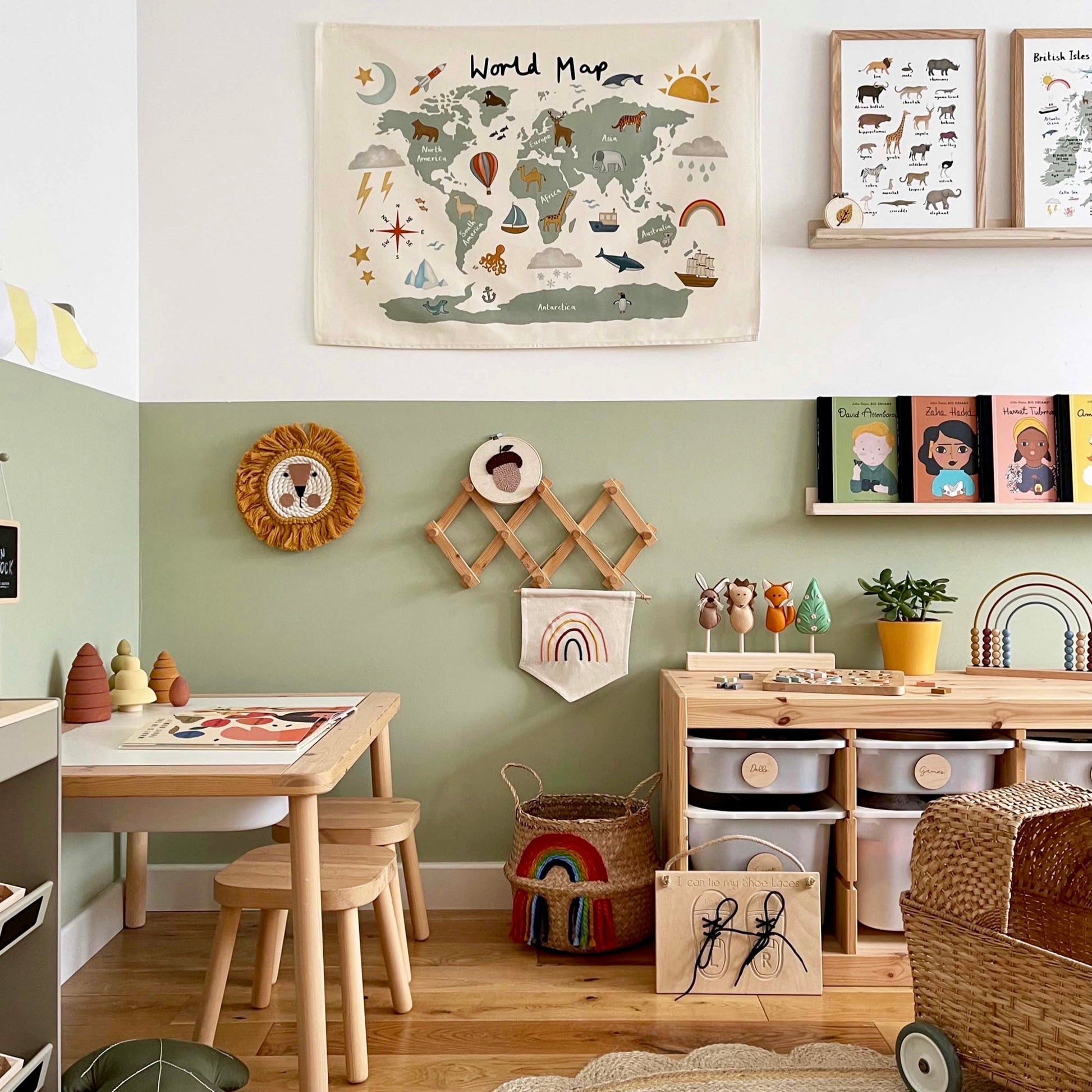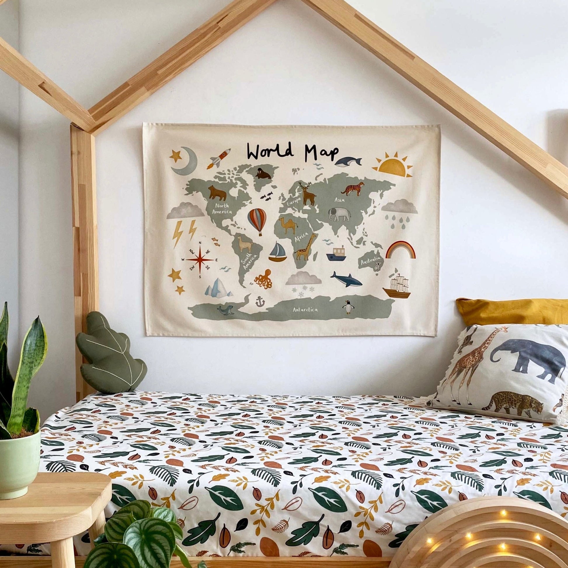 Transform your little explorers bedroom with this sweet World Map Wall Hanging from Kid of the Village in size Large. Designed from 100% unbleached organic cotton, this eco-friendly wall art is easy to display with pins, tape, or adhesive strips (as shown in the photos with command picture hanging strips).