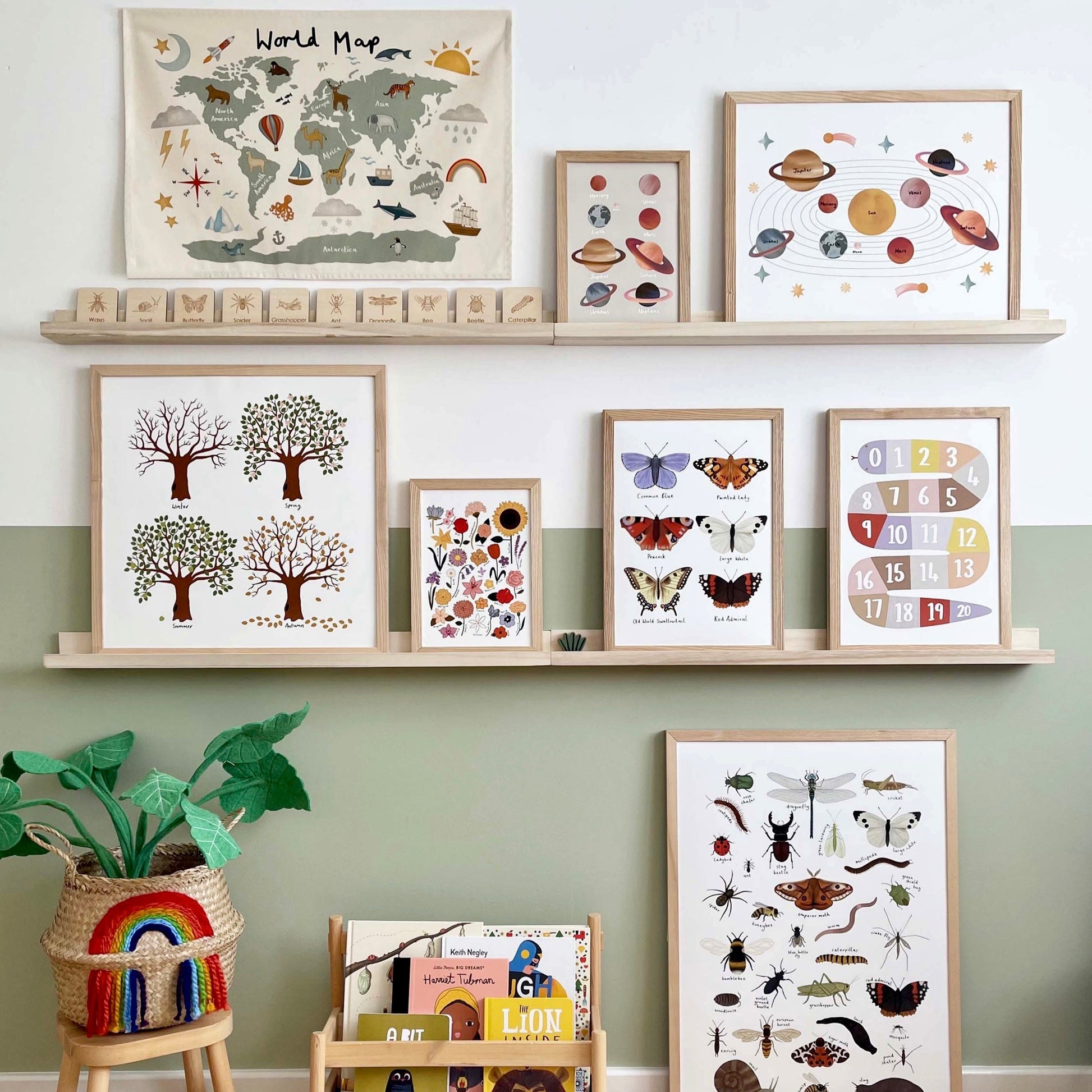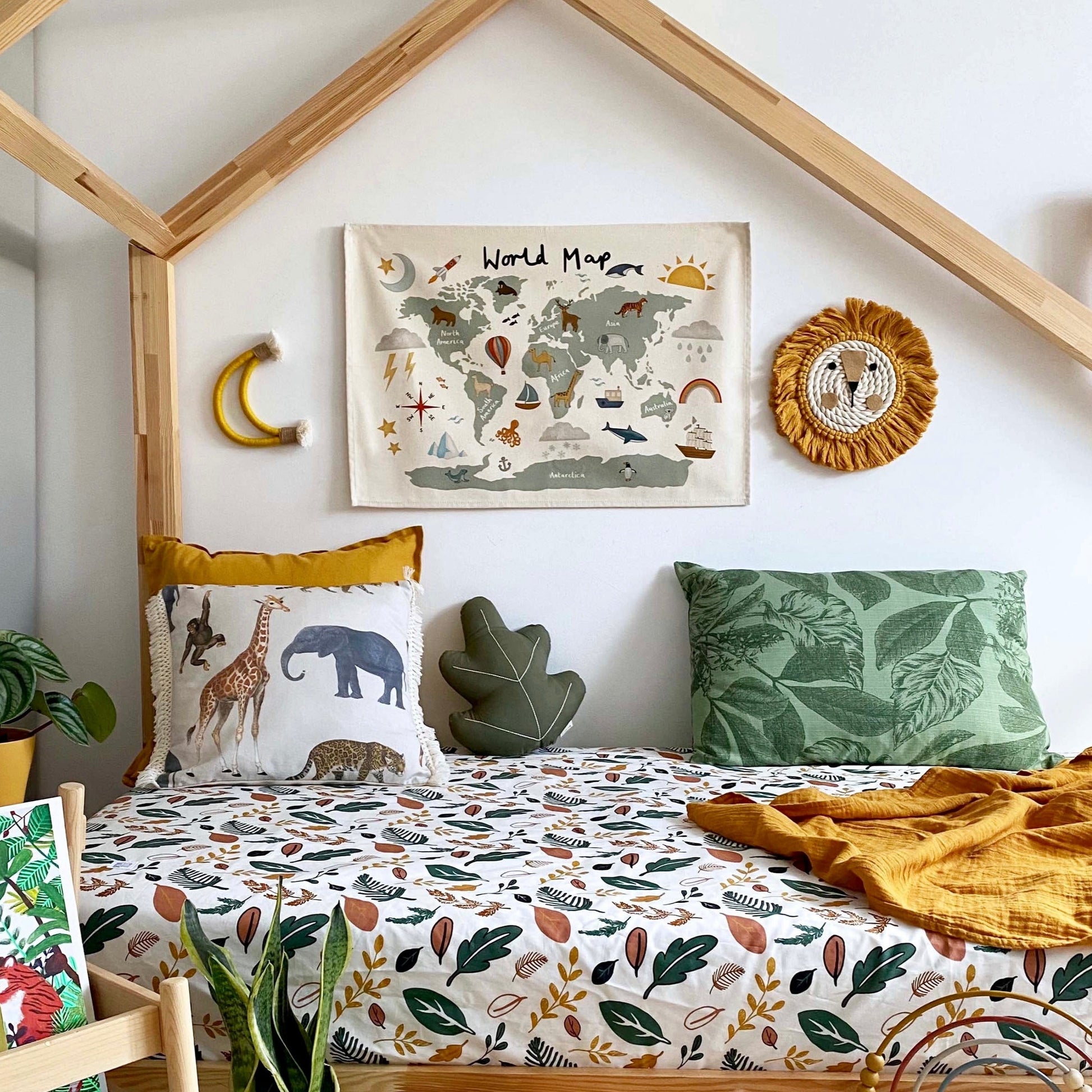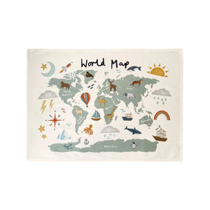 Featuring a beautifully illustrated world map with all the different cotenants, as well as animal and weather inspired illustrations to showcase relevance for each part of the world, Including, a Koala Bear in Australia, an Elephant in Asia and a penguin in Antarctica. This educational and decorative piece is perfect for creating a exciting space for your little explorer.