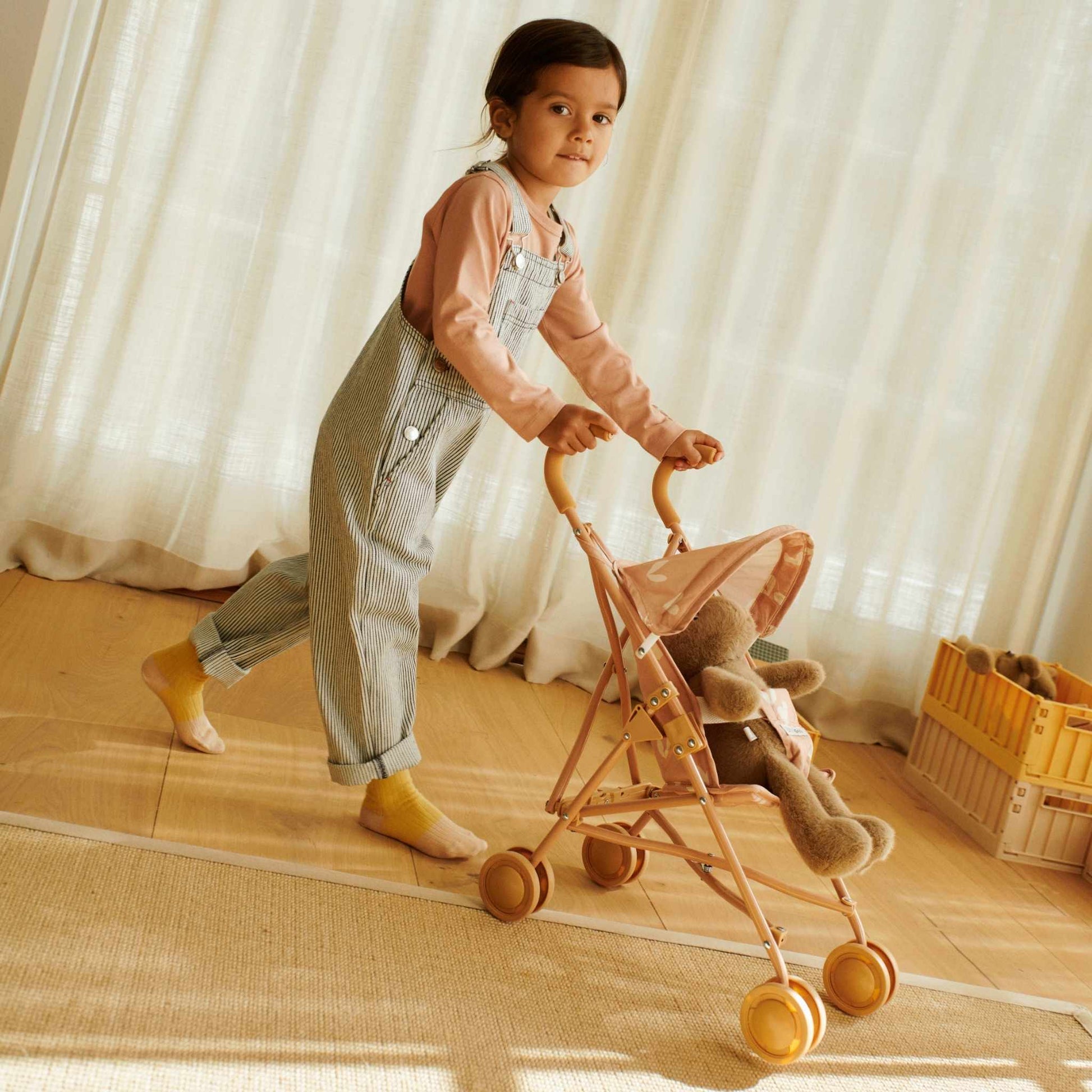 Double wheels keep things steady and powder-coated steel ensures an impressive durability. Just like a real stroller, the Elsie Stroller folds up so that the fun can continue on your travels.