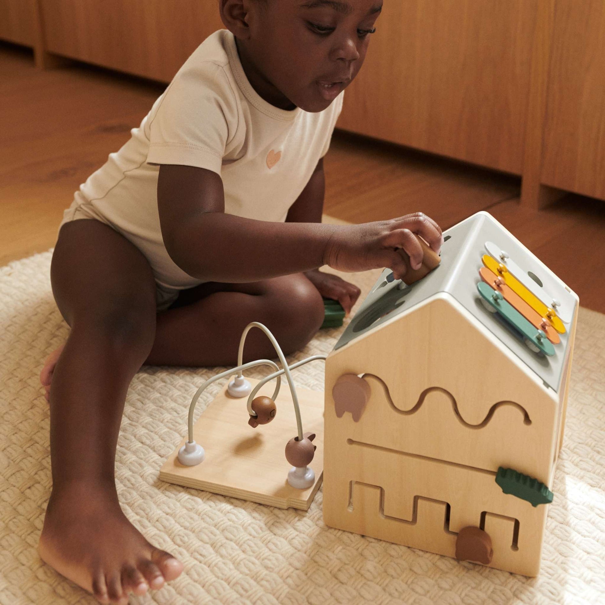 Shaped like a small wooden house, each side features a unique activity for curious little ones to explore. On one side of the roof a colourful xylophone can be played with a cleverly hidden drumstick which doubles as a chimney. Opposite is a shape-sorting puzzle with friendly animal pieces. On the house is a bead maze perfect for practising fine motor skills, a rotating mirror for self-discovery, an opening and closing door and an animal maze.