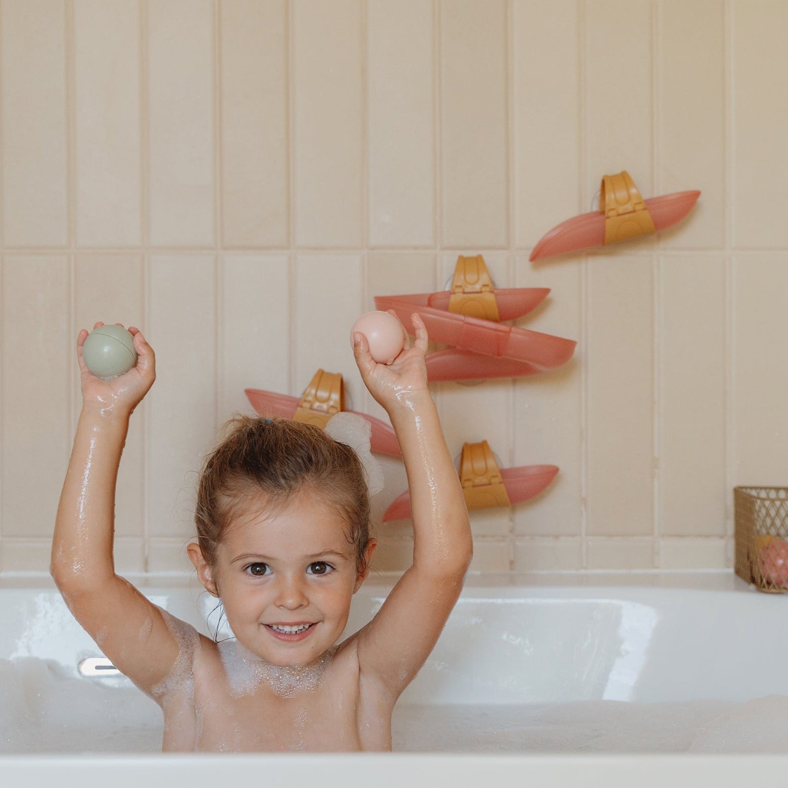 Transform bath time into a rolling adventure with our Bathtub Ball Track set! Simply set up the tracks on the bathroom wall, release the ball, and watch the splashes of fun unfold in the bathtub. The three blue tracks, equipped with suction cups, easily attach to and detach from the bathroom wall, offering endless course possibilities with their curved and straight shapes. Not only does this set provide great entertainment, but it also promotes fine motor skills and problem-solving during playtime.