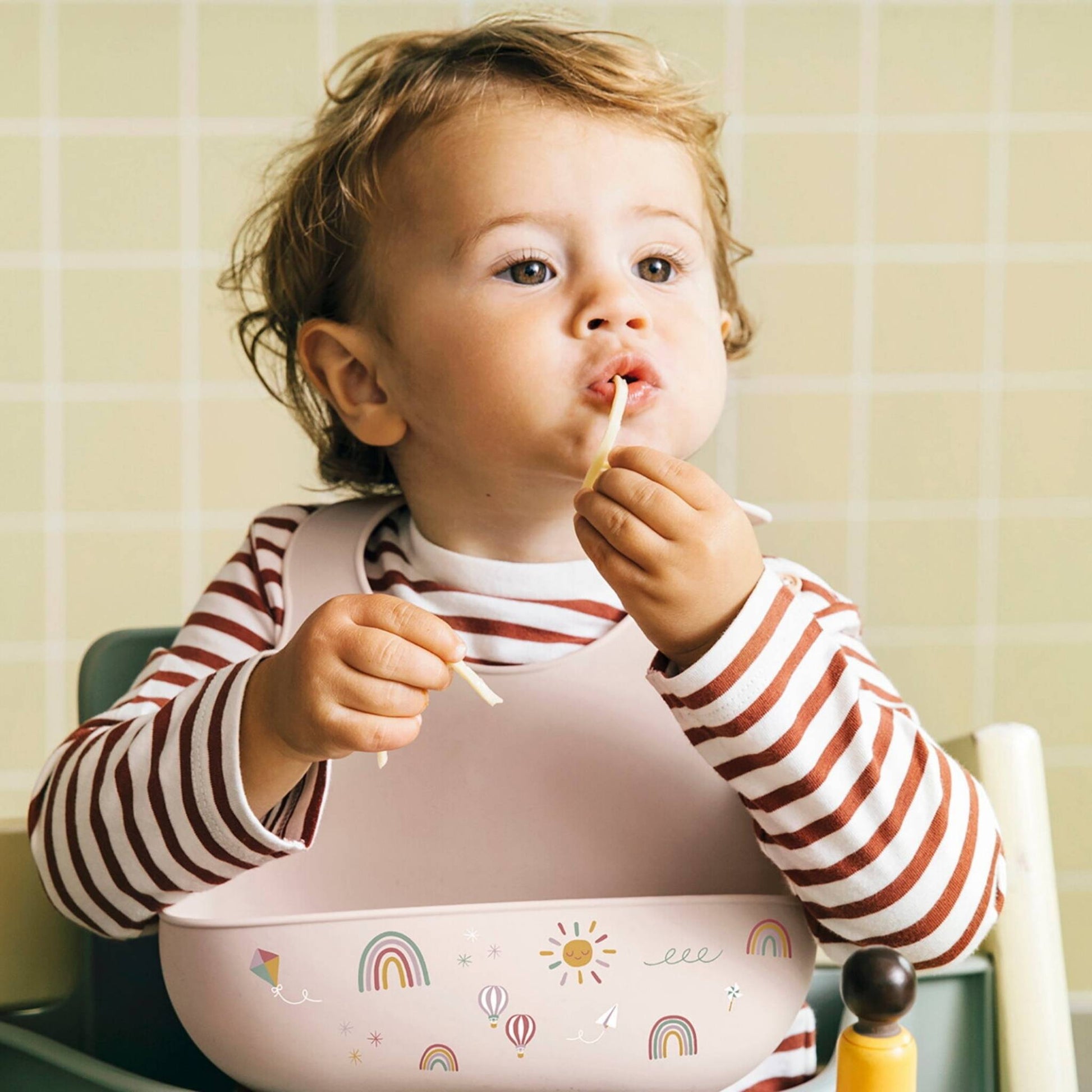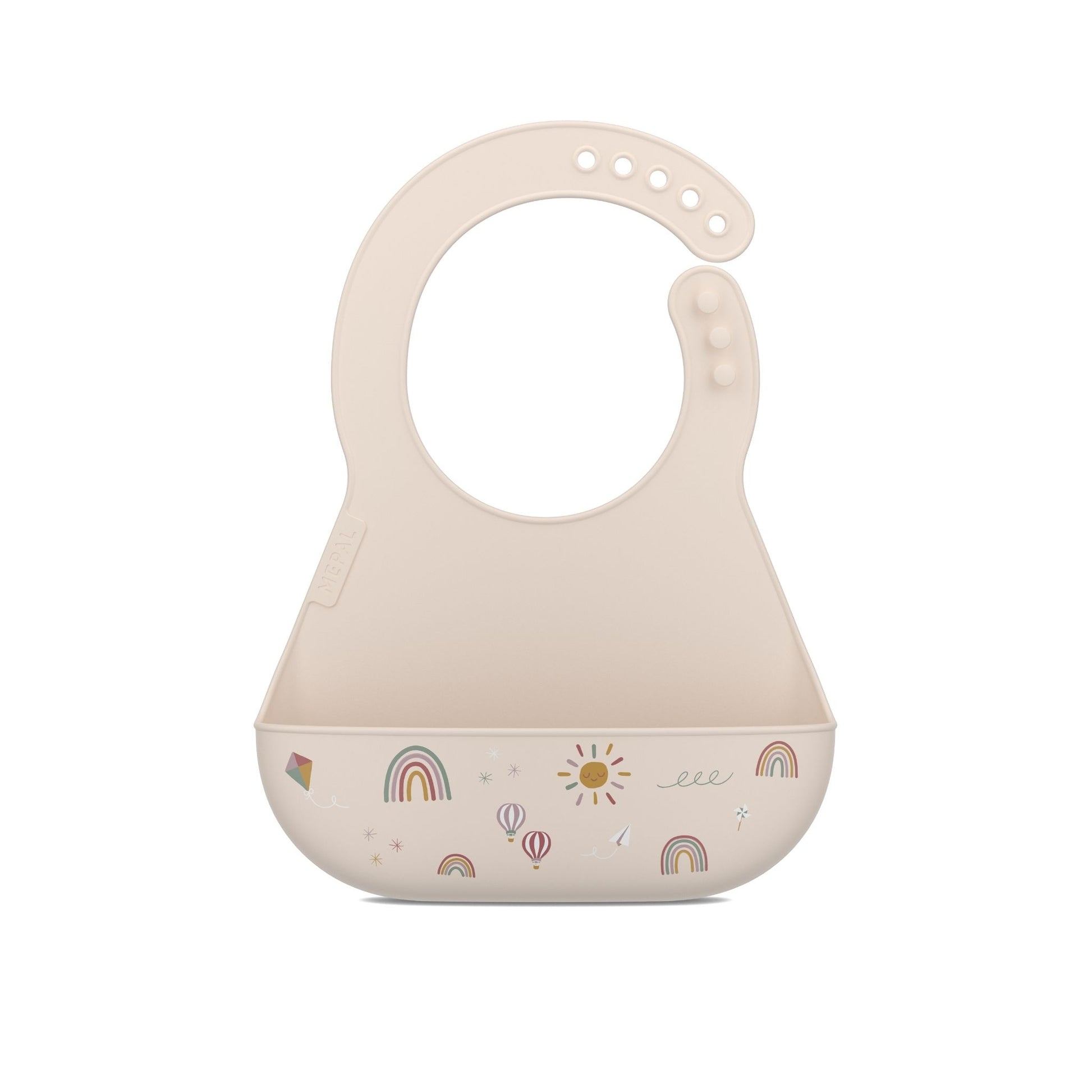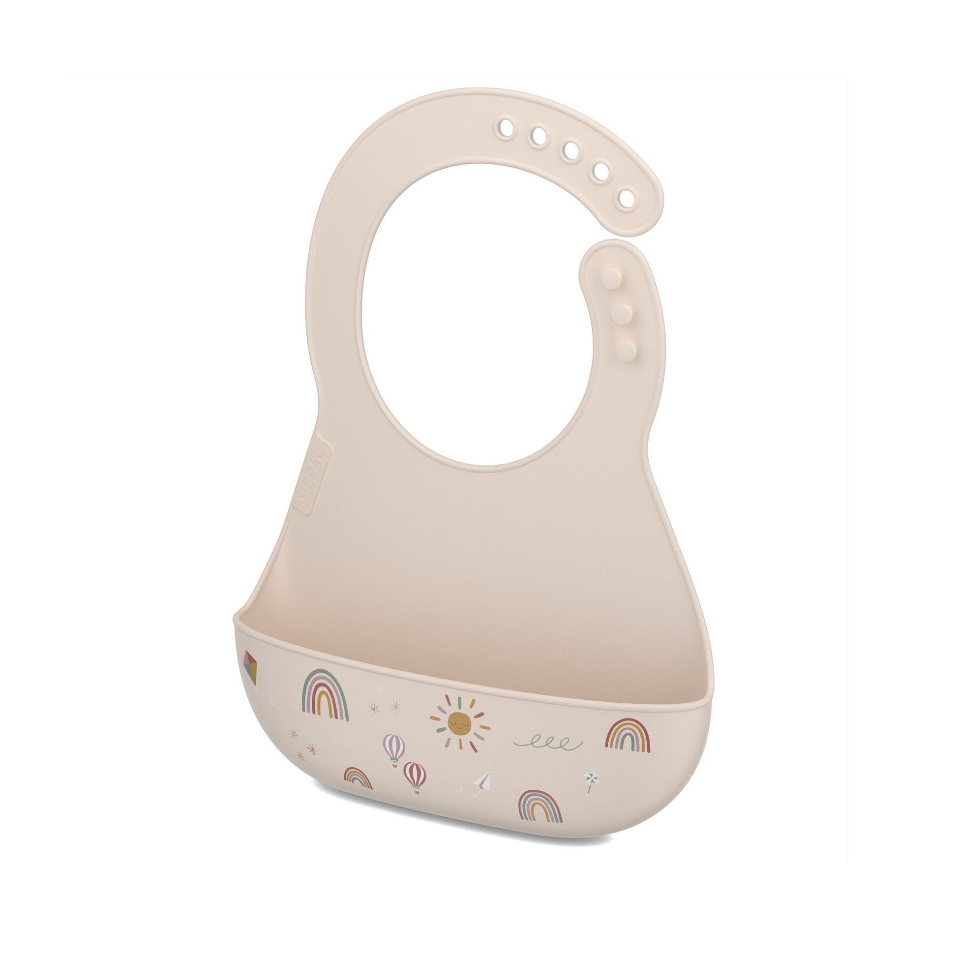 Small eaters, big mess makers - no problem! Keep mealtime mess free with the sweet Little Dutch Mio Bib. Beautifully designed in the adorable neutral Sunshine & Rainbow print featuring a sweet rainbow, sunshine, kite and hot air balloon design. Crafted with durability in mind this bib is made from BPA-free silicone.