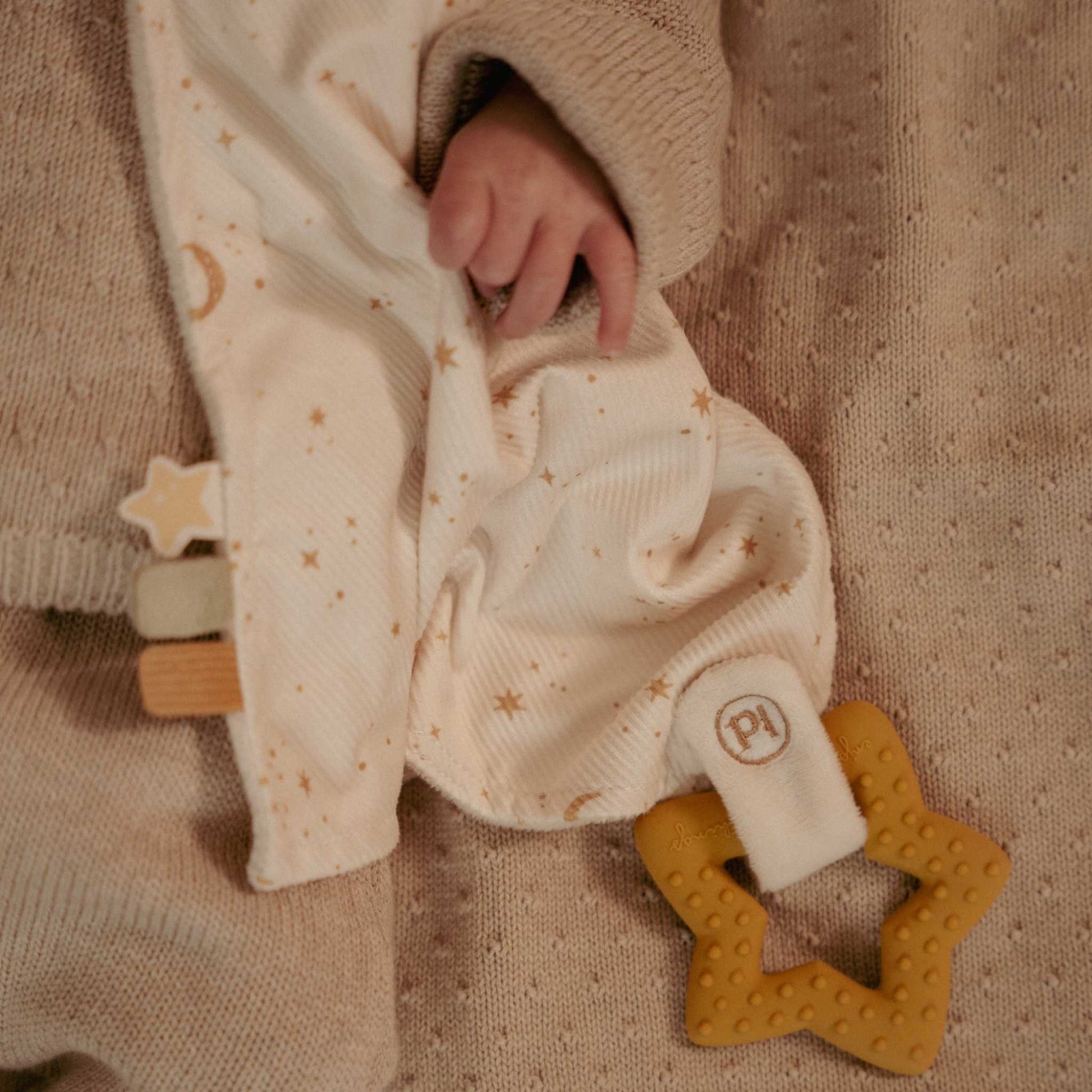 Teething is a big milestone but often is a cause of discomfort in little ones lives. The Newborn Naturals Cuddle Cloth with Teething Ring offers the perfect combination of comfort and relief. With a wonderfully soft blanket, adorned with moons and stars, that provides warmth and security and a chewable silicone star to keep your little one entertained and soothe sore gums as they get to work.