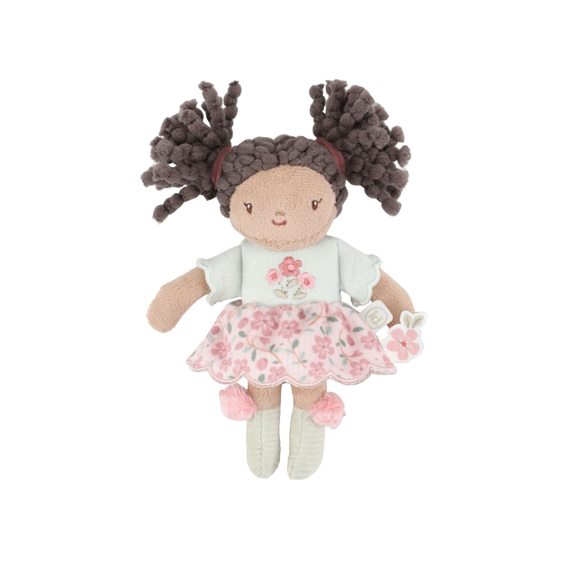 Evi is beautifully dressed in a sage green top with delicate pink flowers, paired with a floral pink skirt. She features brown eyes and brown hair styled in cute pigtails, giving her a gentle and friendly appearance. Designed with Little Dutch’s renowned attention to quality and detail, Evi is made to be loved for years to come.