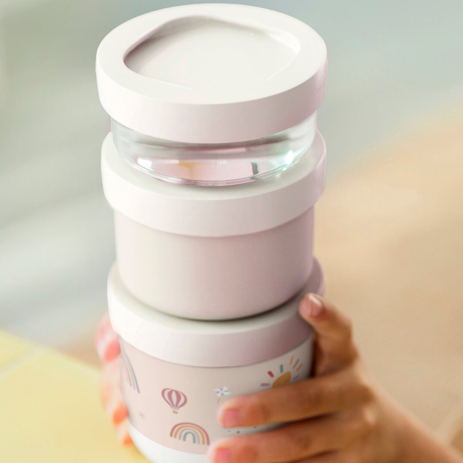 Beautifully designed in a neutral colour, each container has it's own design including clear, neutral and sunshine and rainbow print. All featuring white lids, this dishwasher safe set makes every snack moment a little adventure.