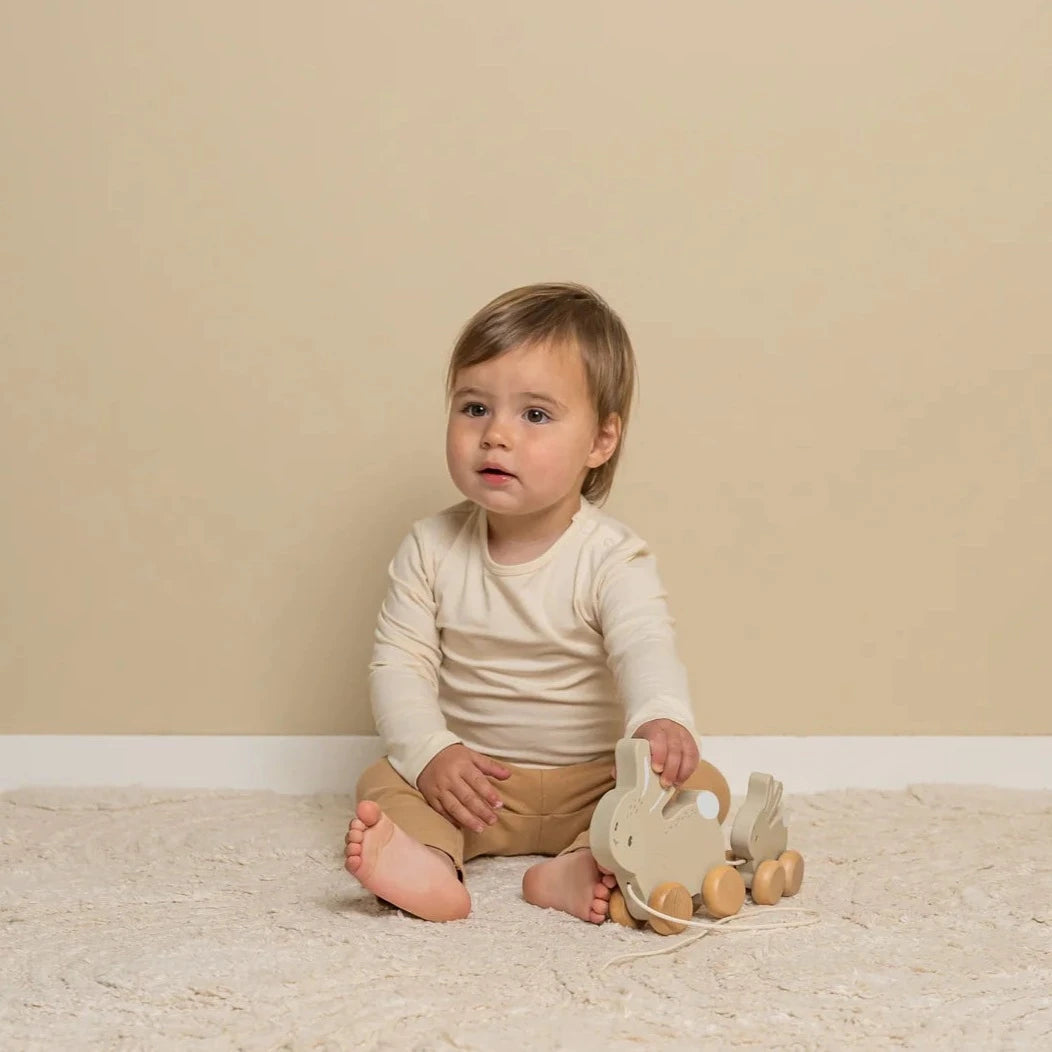 Meet the adventurous bunnies that love exploring the house with your little one! With a simple pull of the string, embark on exciting adventures together. Crafted from durable wood, these pull-along animals are always ready for play, encouraging your child to walk and supporting their motor development. The string has a functional length of approximately 50cm, ensuring endless fun and exploration.