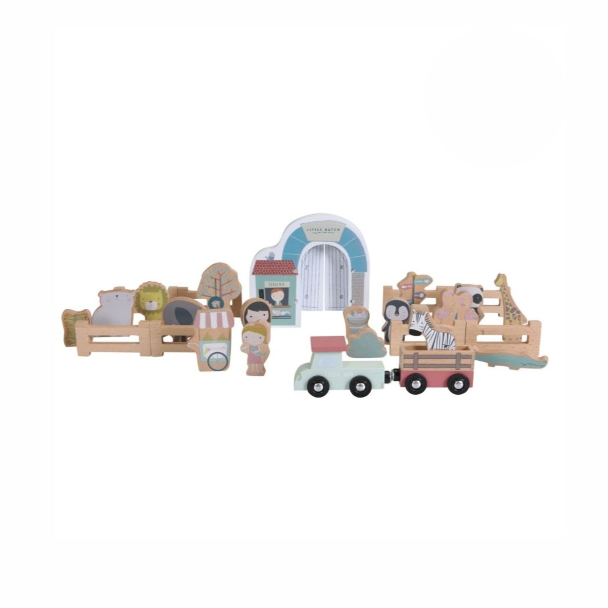 Enhance your train track adventures with these wooden animals and zoo elements, transforming the last train stop into a lively day at the zoo. Crafted to fuel your child's boundless imagination, this extension set features a ticket counter with an entrance gate, maintenance wagon with a trailer, and a charming ice cream stand. The assortment includes a variety of animals, such as a zebra, elephant, polar bear, penguin, giraffe, lion, panda, flamingos, crocodile, all designed to fit in the trailer for extended hours of delightful playtime. Please note that track pieces are not included in this set, and additional extension sets for the train track are available..