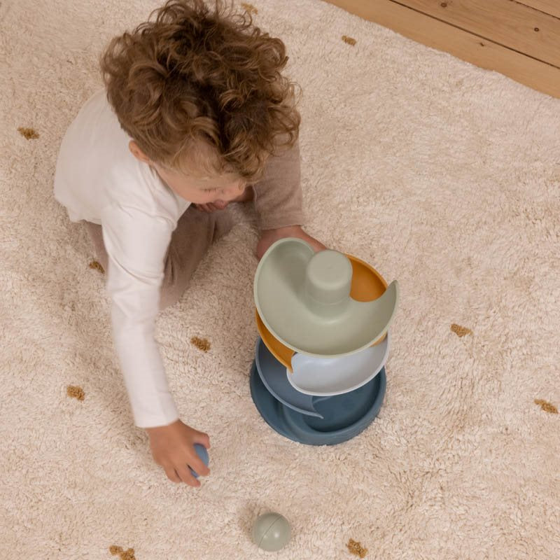 The colourful toy consists of 5 soft-hued pieces that your little one can easily stack. Drop the balls one by one onto the top tier and see how each of them winds and rolls down.