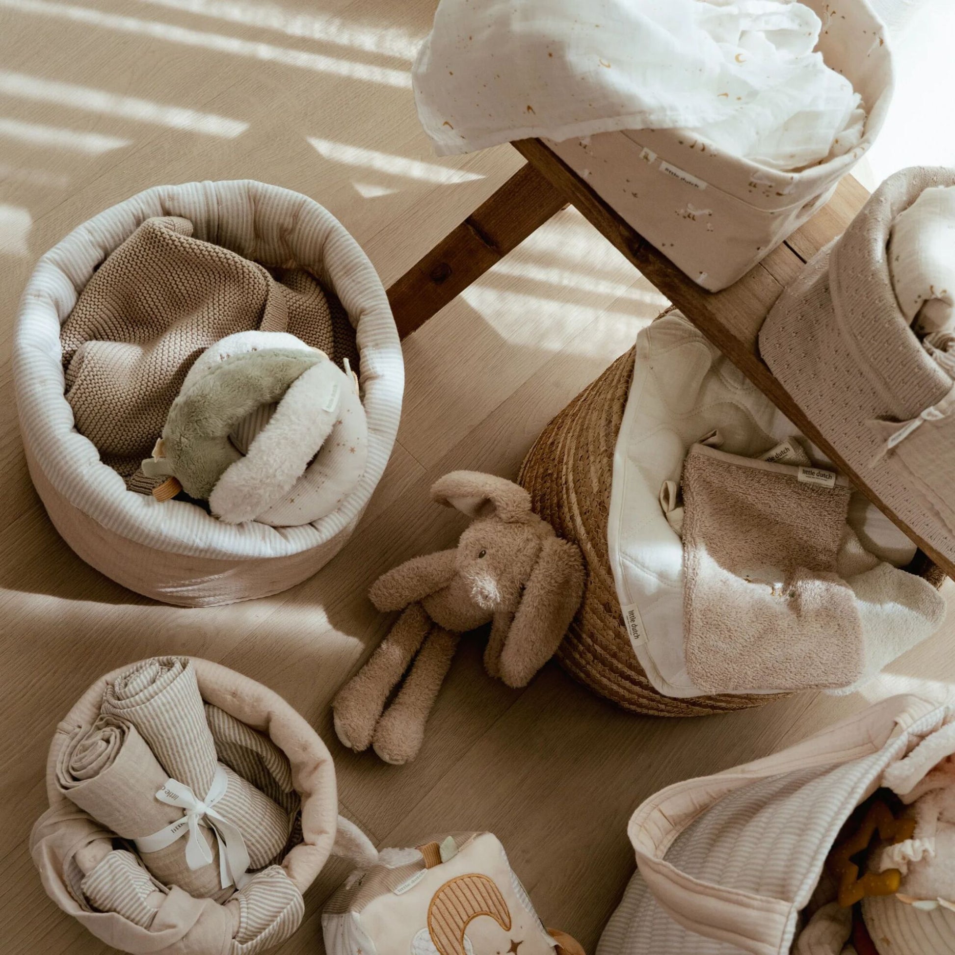 With its neutral beige colour palette and soft natural aesthetic, with subtle stripes that bring a gentle, timeless look that complements any interior. Whether placed on a changing table, shelf, or dresser, the basket’s sturdy shape and high-quality finish make it a great storage solution.