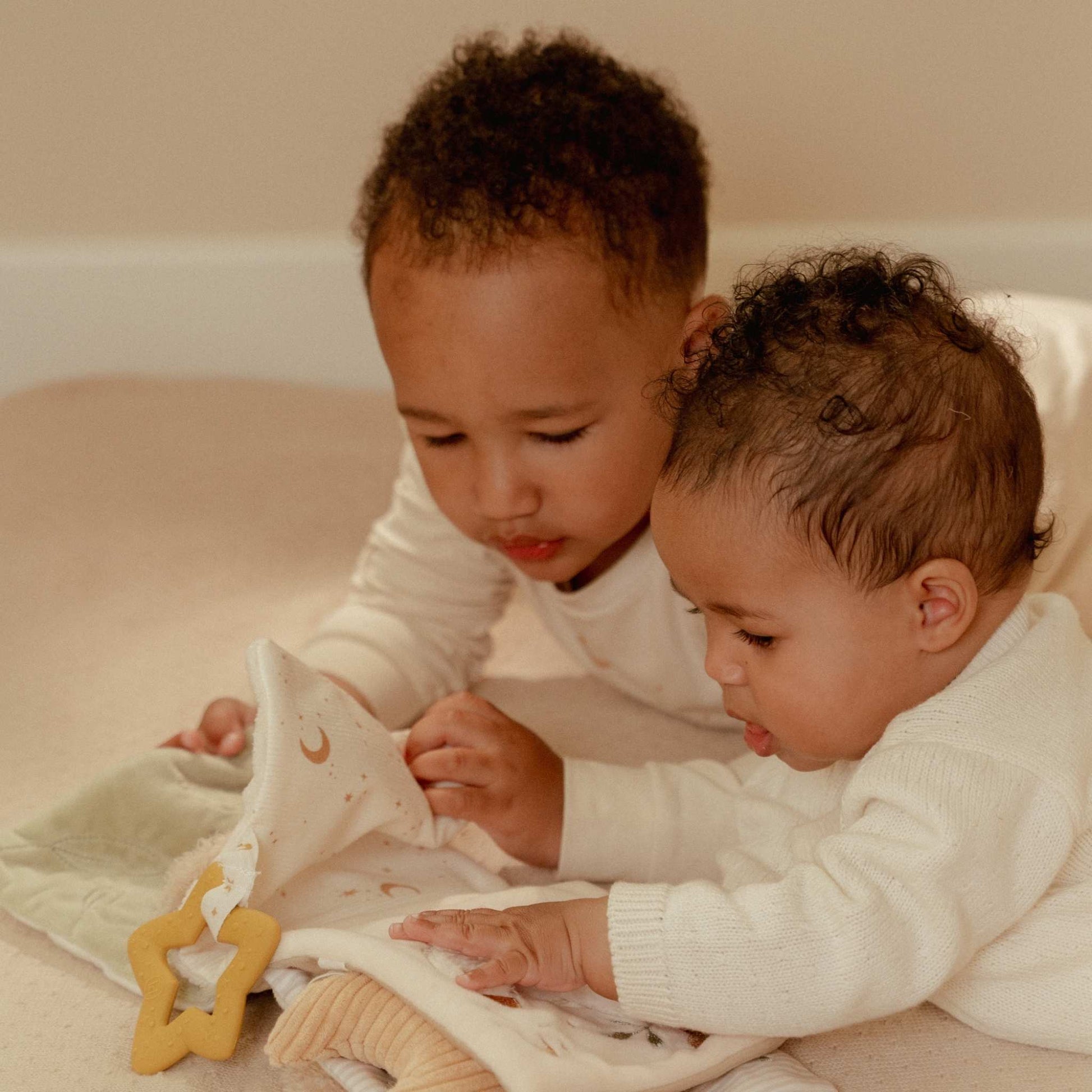 A delightful little book filled with playful textures, crinkly pages, mirrors and sweet designs that stimulate the senses as your little one excitedly flips through its pages. Easy to hold and the perfect size for little hands to grasp and feel, this book simply attaches to a stroller or pram to take the fun anywhere.