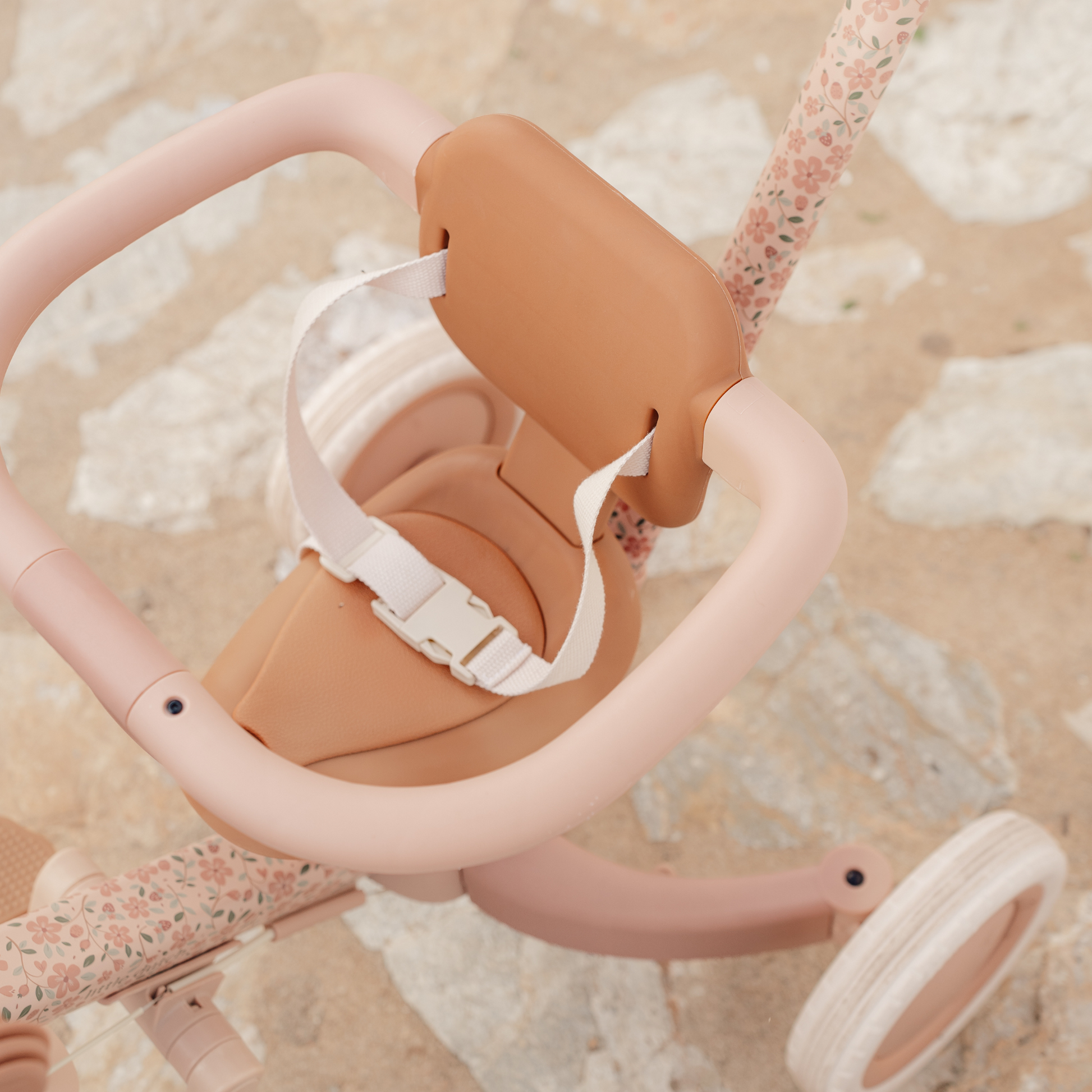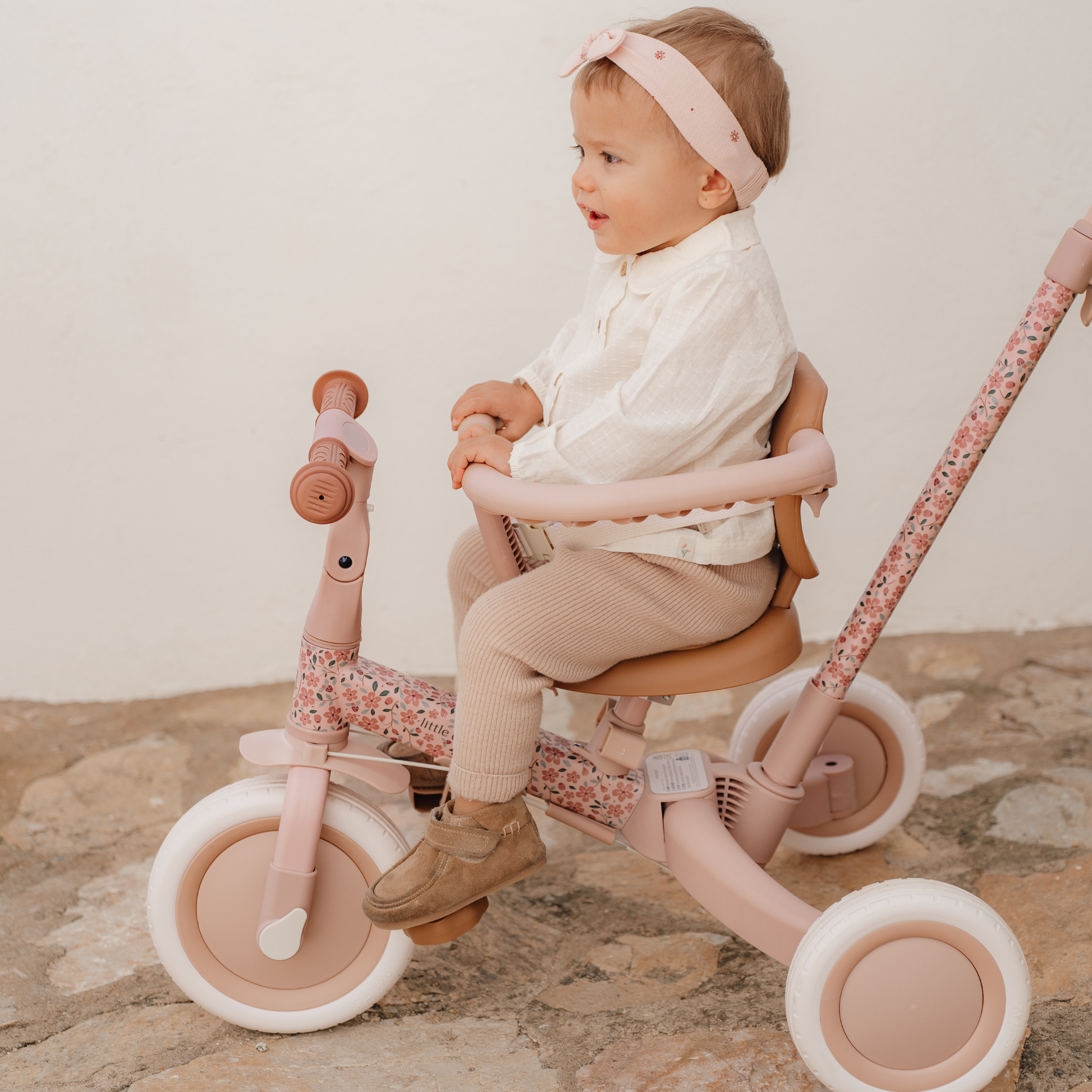 Zoom into play with the fun 4 in 1 trike in sweet pink with a beautiful floral design! The Little Dutch 4 in 1 trike will grow with your child from their first adventures on a bike to independent cycling.