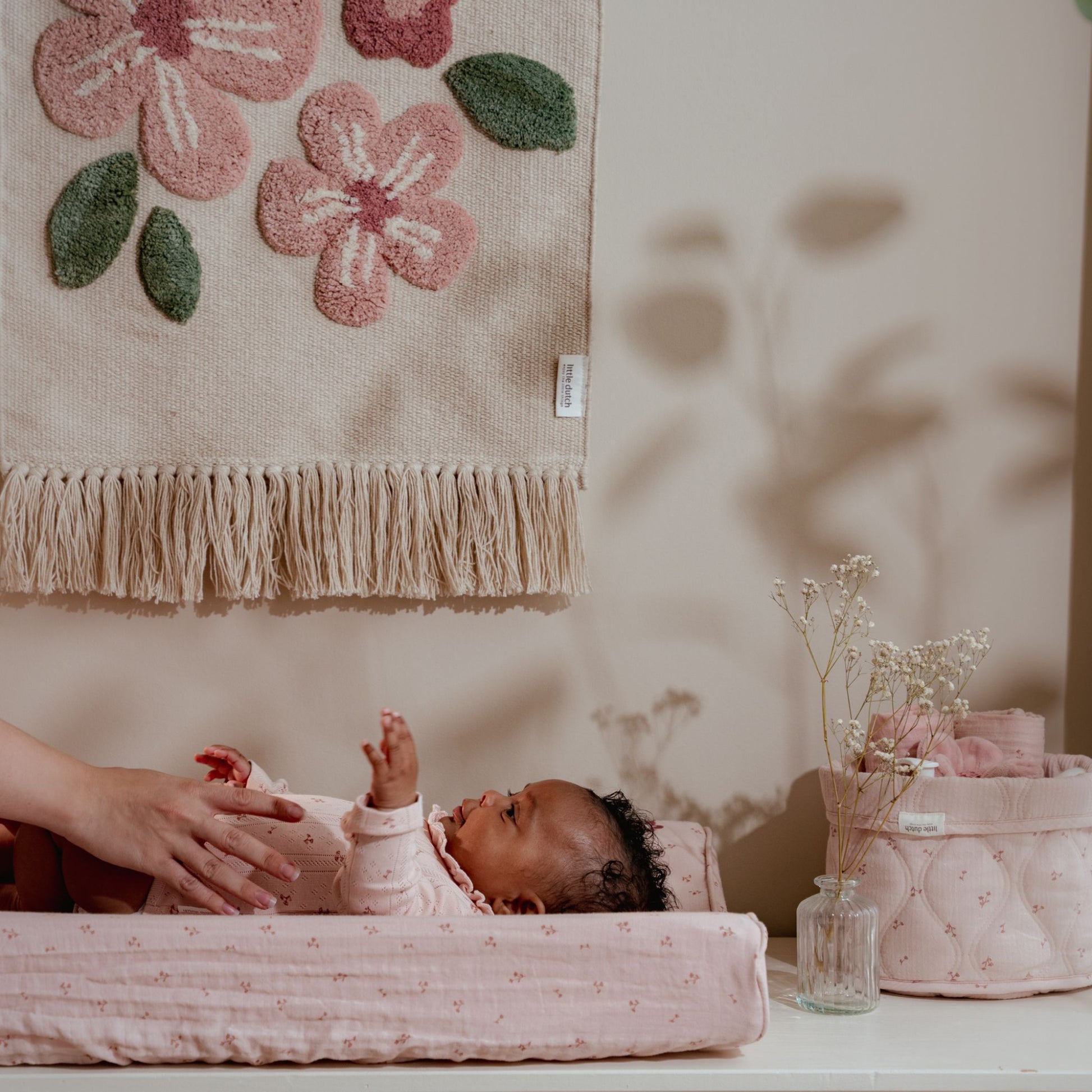 Gently add character to your nursery or playroom with this sweet Wall Tapestry from Little Dutch's Fairy Floral collection. Pink flowers mix with fresh green leaves on a soft background, bringing a natural, cosy aesthetic your wall. The soft-tufted details of the flowers and tasselled fringe give a warm feel, while the gentle colours of the hanging make it easy to pair with various colour themes and décor choices.