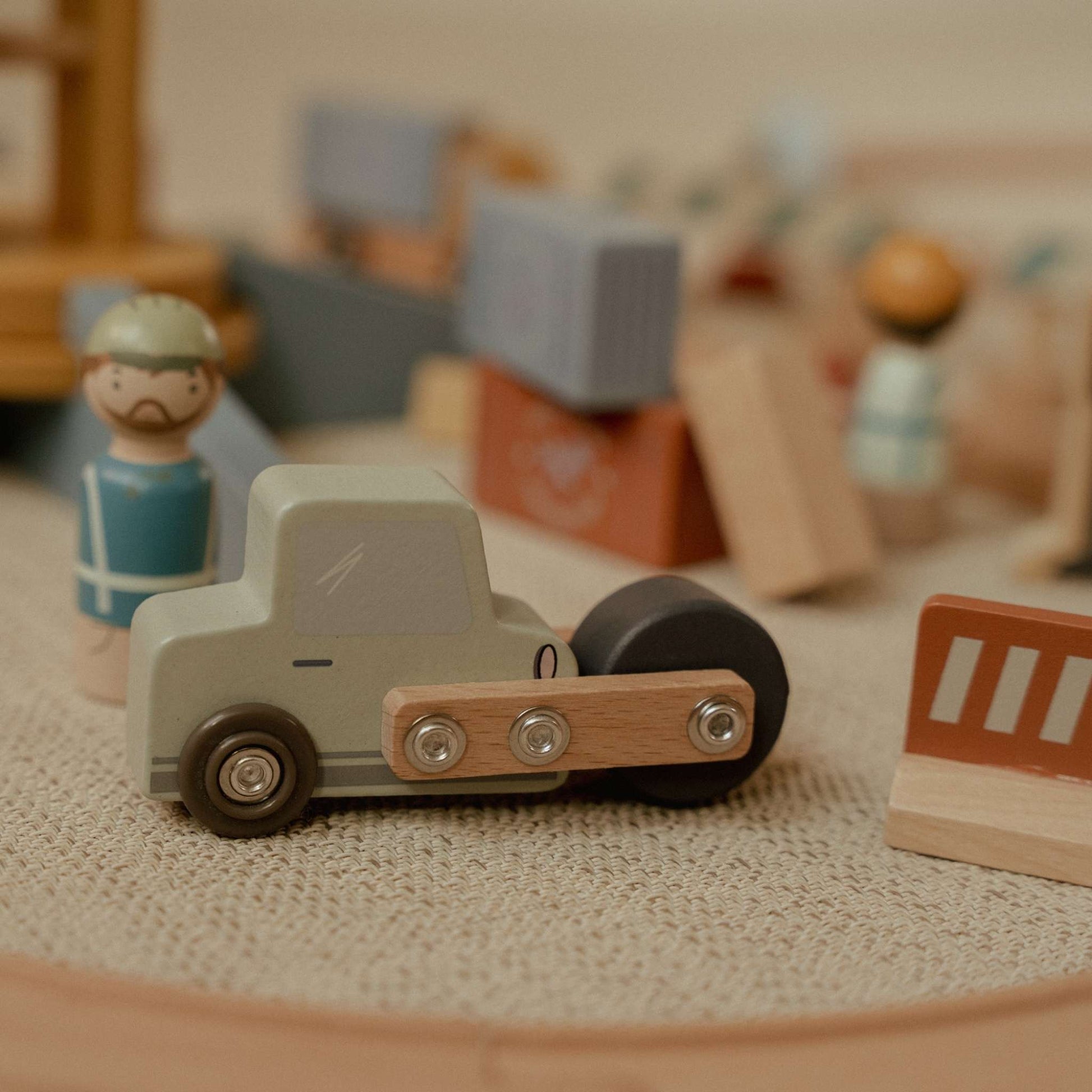 Build big cities and friendly villages with the Little Dutch Wooden Train Track Crane Set.