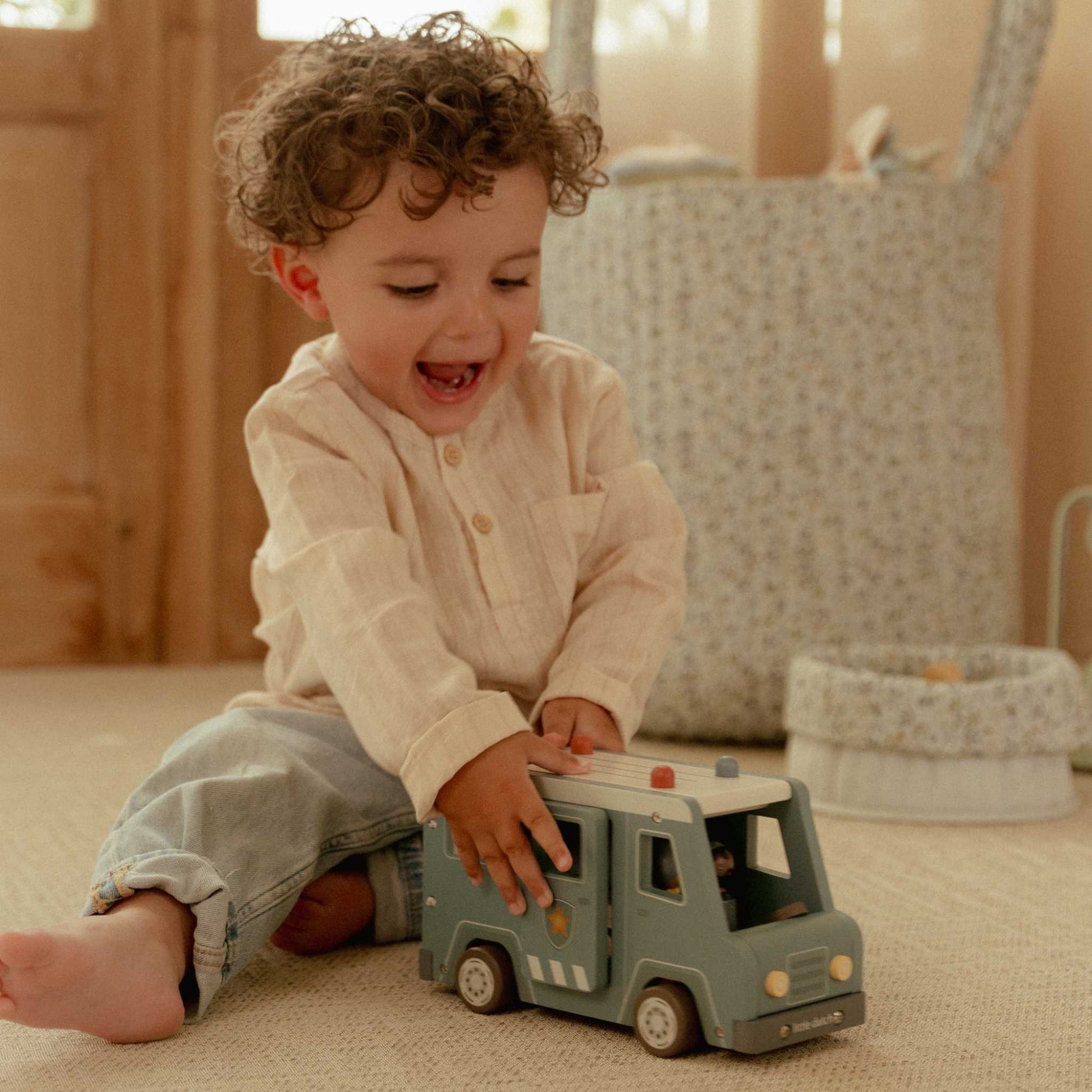 Burst onto the scene before the robbers get away with the Little Dutch Wooden Police Van.