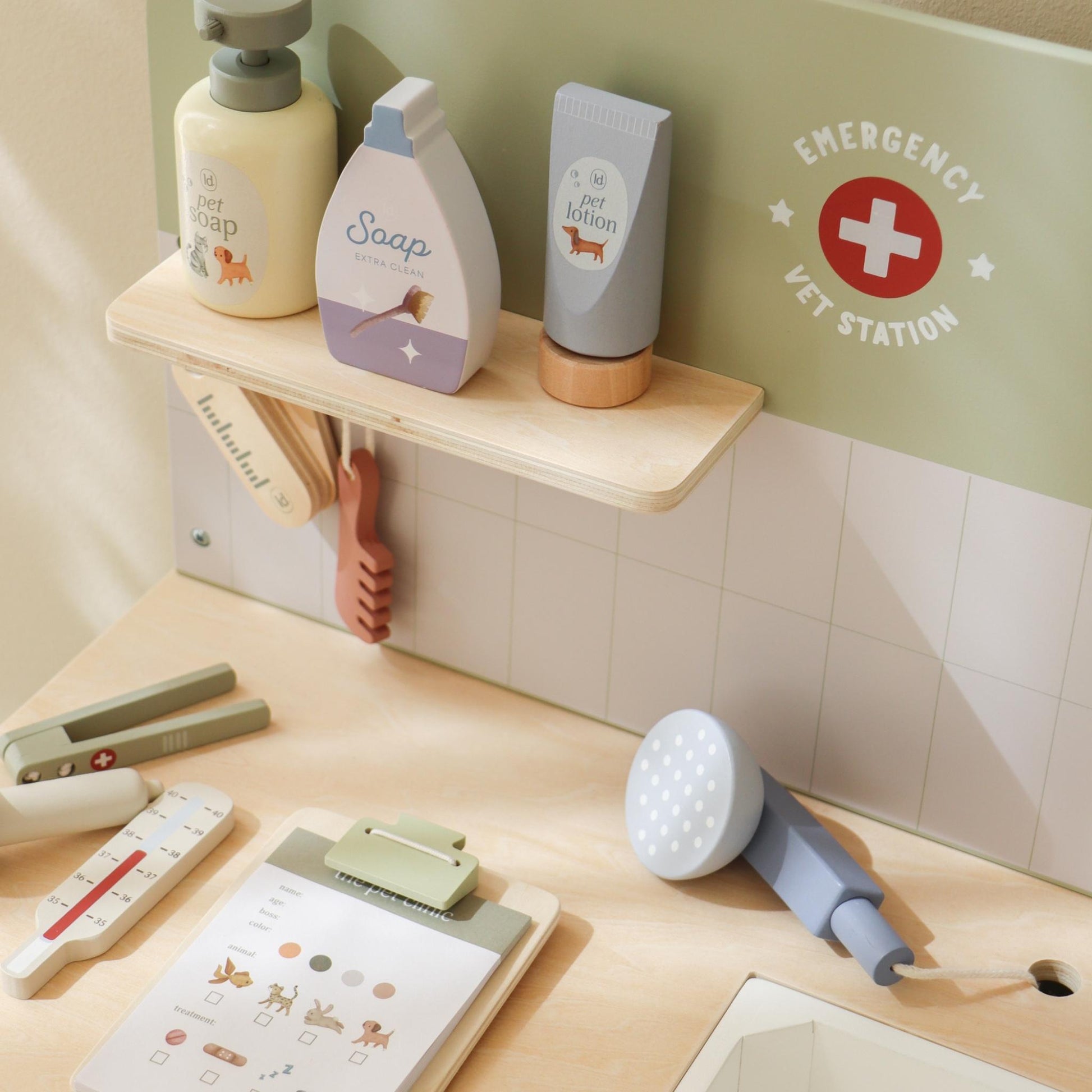 This charming vet set includes everything your little vet needs to help pets in need of love and attention. From tweezers, a thermometer and measuring tape for check-ups, to pet soap, lotion and a comb to get them looking their best before heading home.