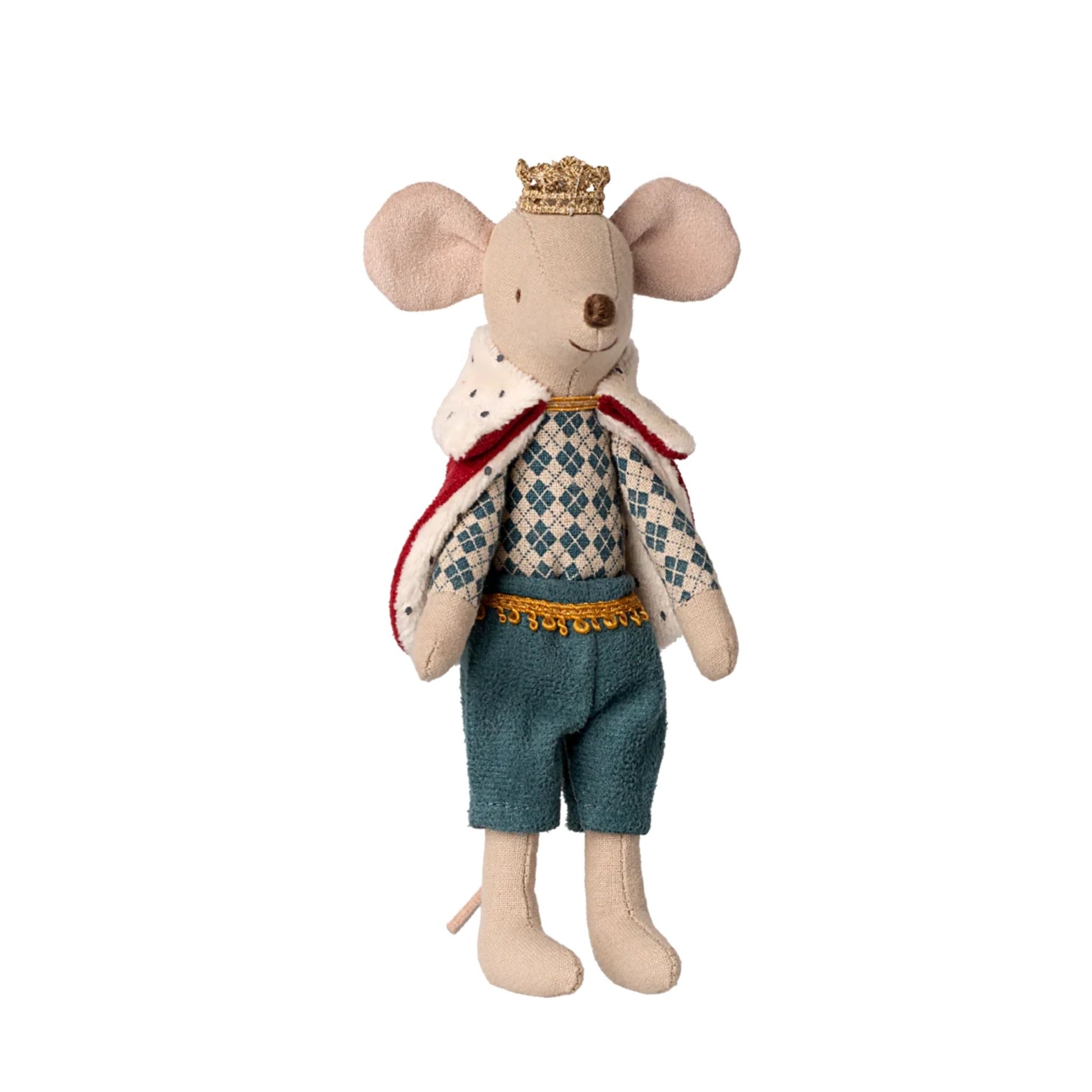 A kingdom needs guidance and protection and the Maileg King Mouse is ready to serve his loyal subjects. Decked in a noble red cape, the King's regal appearance is completed with a resplendent crown neatly placed atop his head. The King adds real presence to your mouse collection, and alongside the queen, he is ready to bring a touch of sovereignty and ceremony. Arrives in a cute castle-shaped box.
