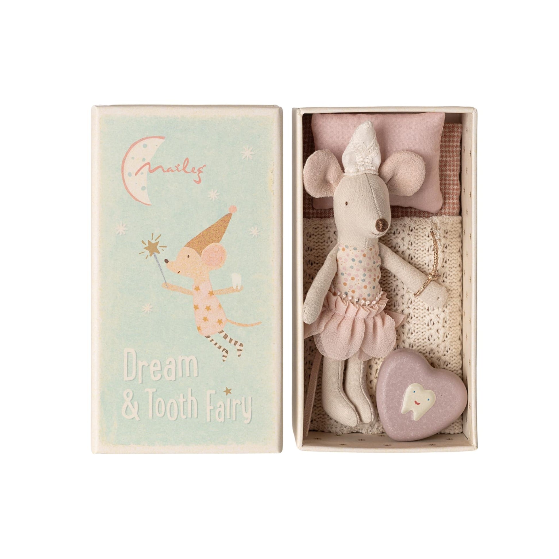 She comes tucked inside a beautifully designed matchbox, resting on soft, cosy bedlinen, including a pillow and knitted blanket. Also included with her is a small tooth box perfect for safely storing tiny treasures until the tooth fairy visits.