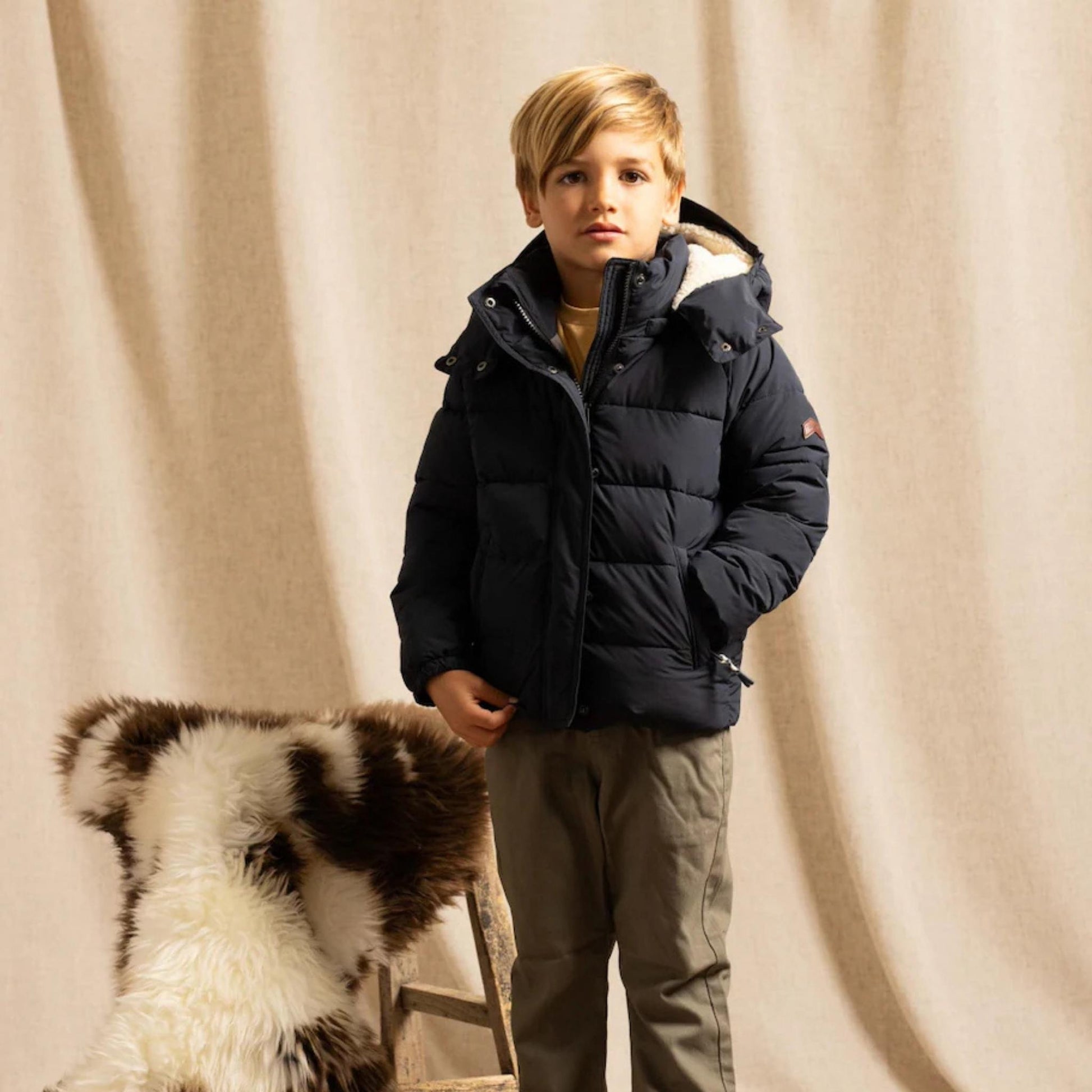 Finished in sweet ink navy colour, this kids’ puffer jacket also includes thoughtful details like an interior name patch to prevent it from getting lost and a climbing rope-inspired zip pull. Perfect for everyday adventures.