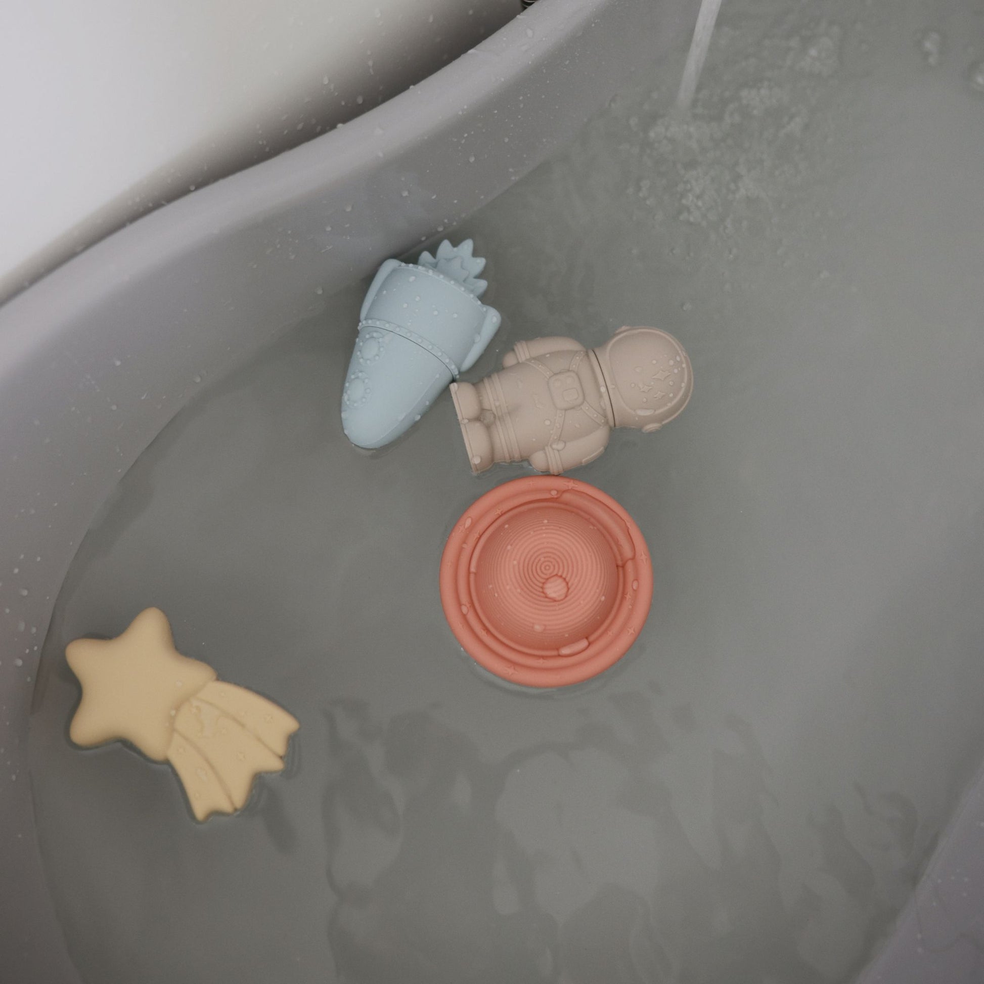 Bath time is a blast with this adorable space-themed Bath Play Set from Mushie. A shooting star, rocket, planet and astronaut combine for a galactic bath experience. This set is designed to engage and entertain, making bath time more pleasant for parent and child. The textures of the toys provide sensory stimulation, while the variation in colour promotes cognitive development.