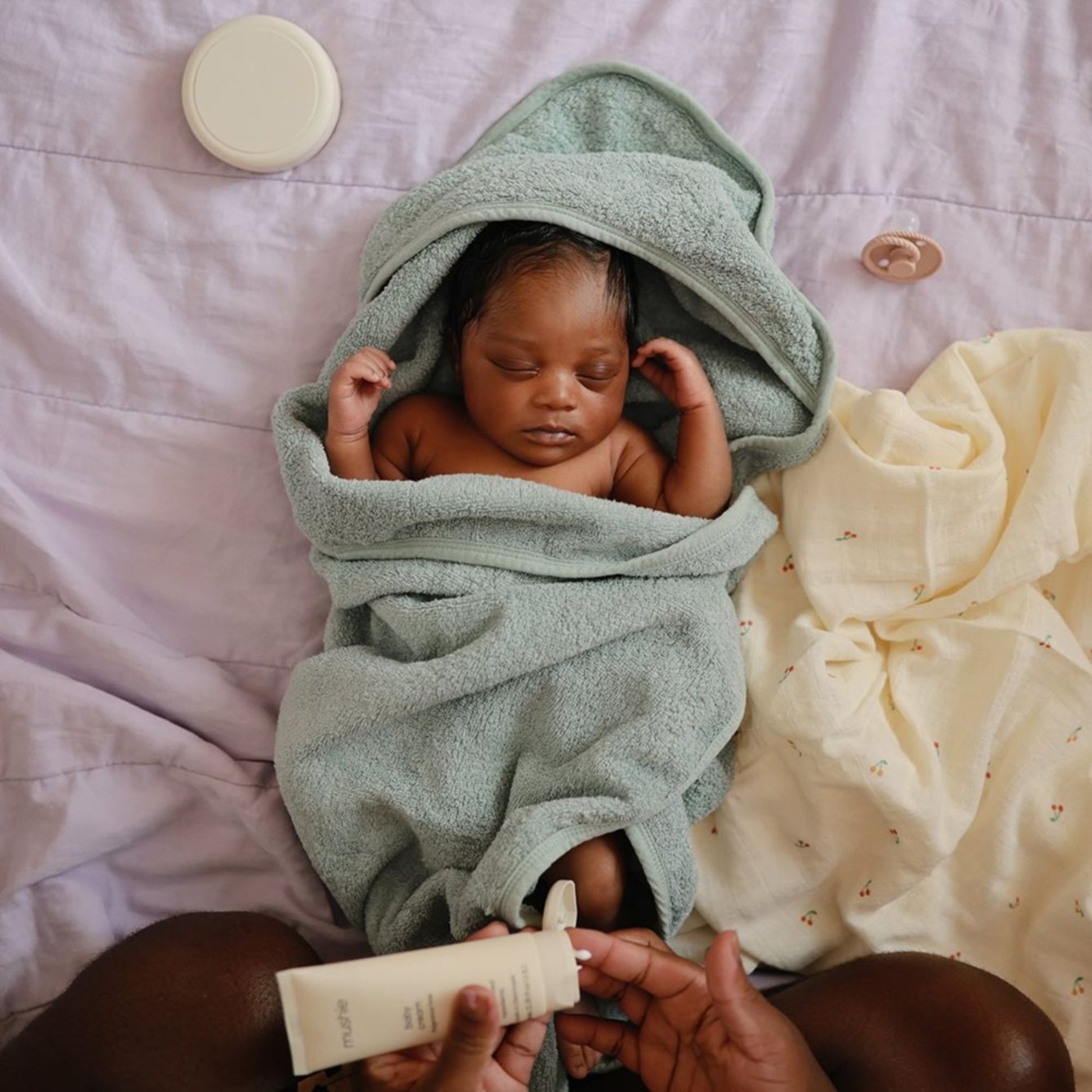 After the fun of bath time, what better way to get your little one dry than with this 100% organic cotton hooded towel from Mushie. Its super-soft absorbent material ensures dryness and comfort while the hood makes certain their whole body will stay nice and warm throughout the transition.