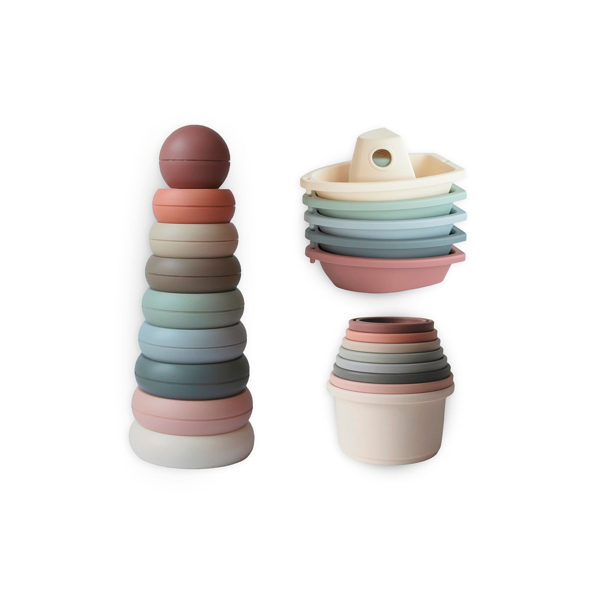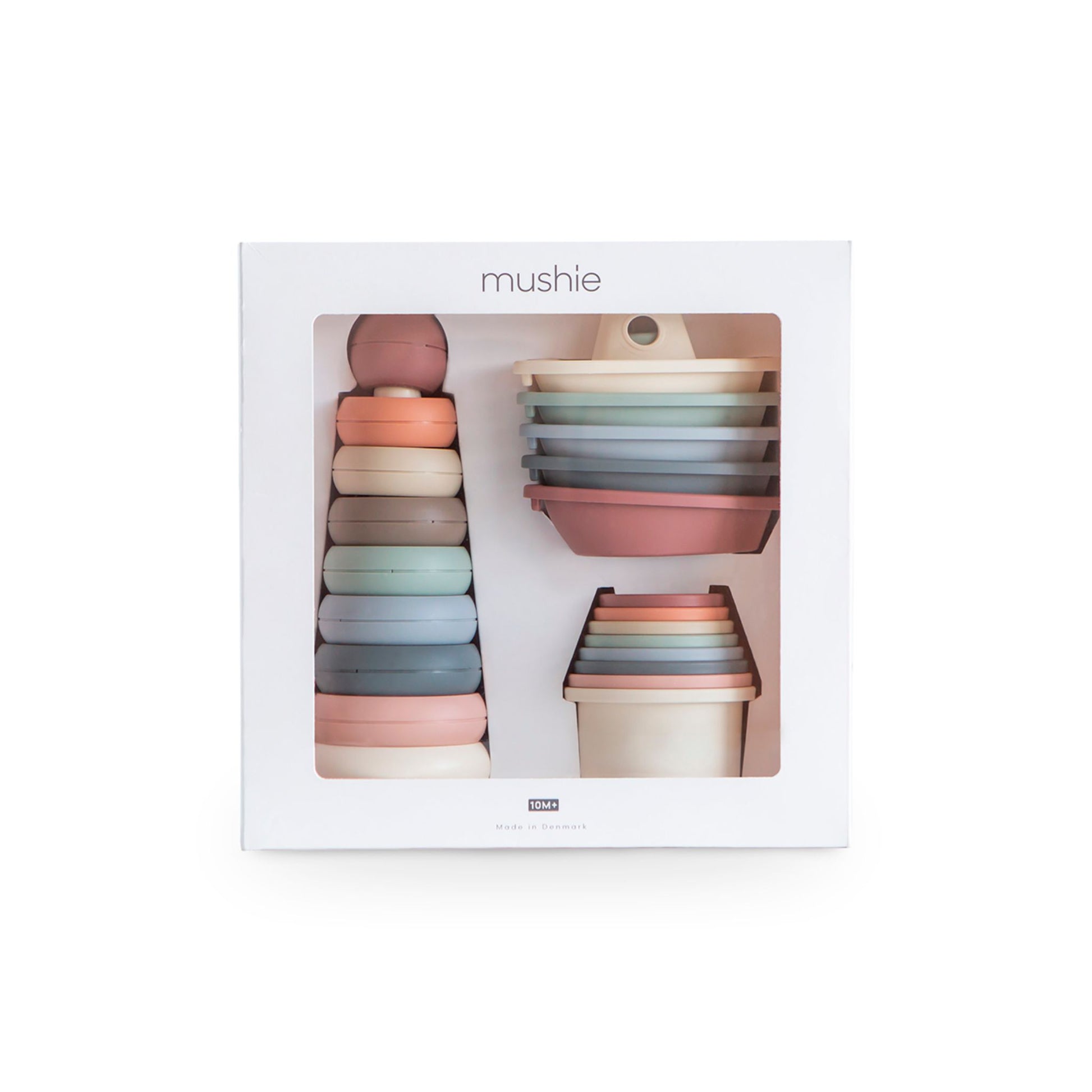 This beautiful box of toys from Mushie is the ideal gift for combining fun and developmental skills. The Giftbox contains three toys in soothing colour tones, offering a variety of exciting play options.