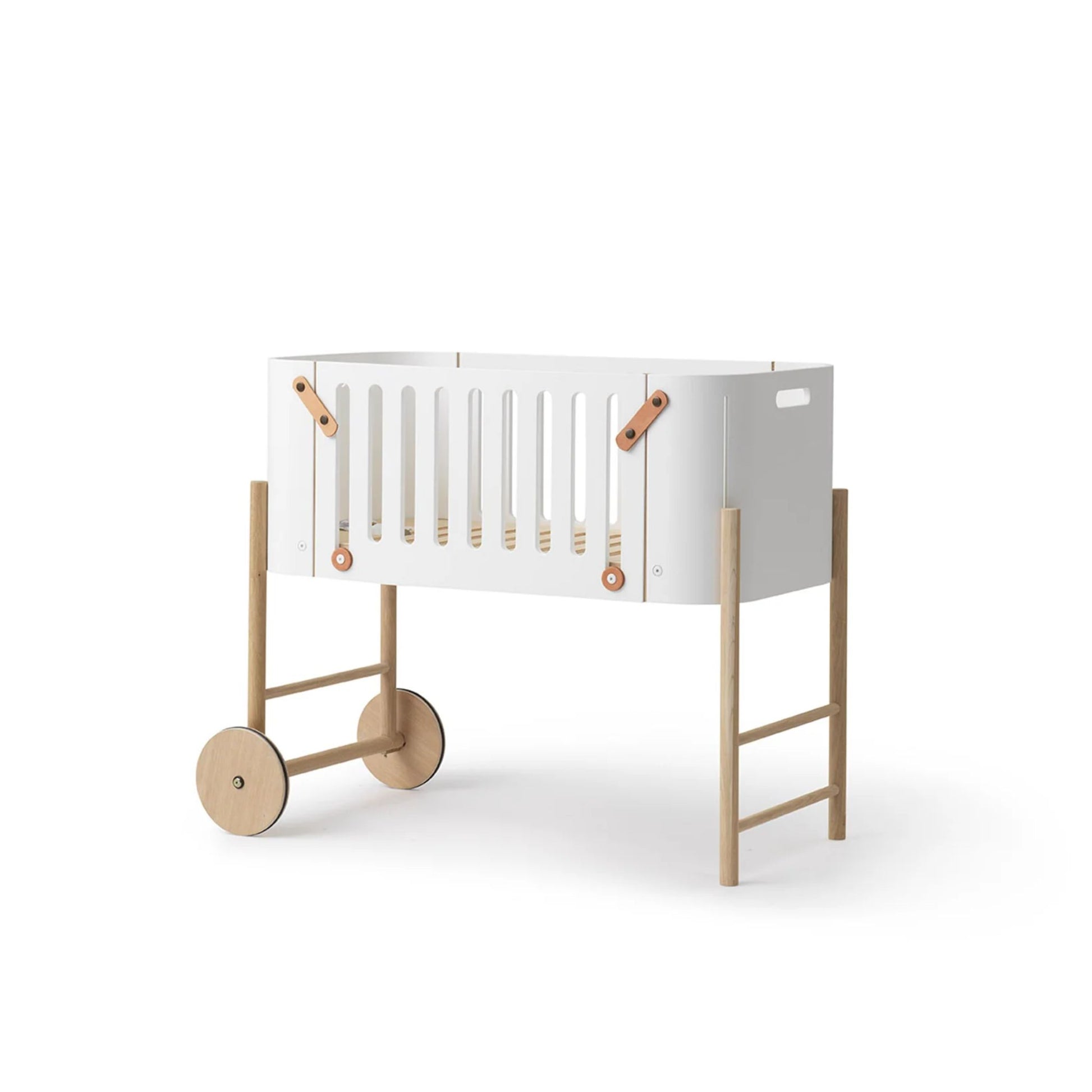 During the day, with both sides up, the bed can play the role of a cosy cradle. Rubberised wheels mean it can be smoothly and quietly be wheeled from room to room. The bed's stylish curvature and delicate proportions allow it to seamlessly adapt to each room's existing interior.