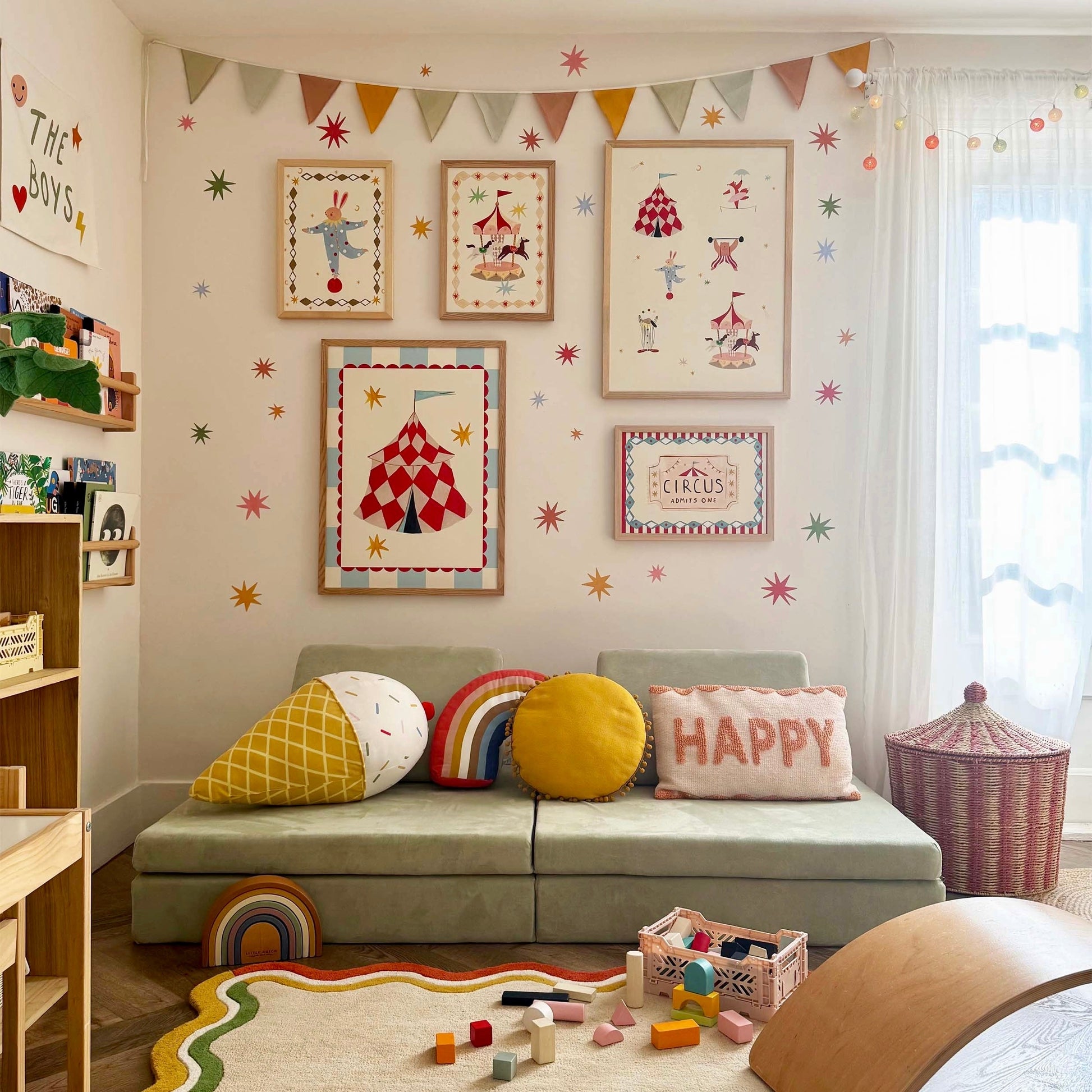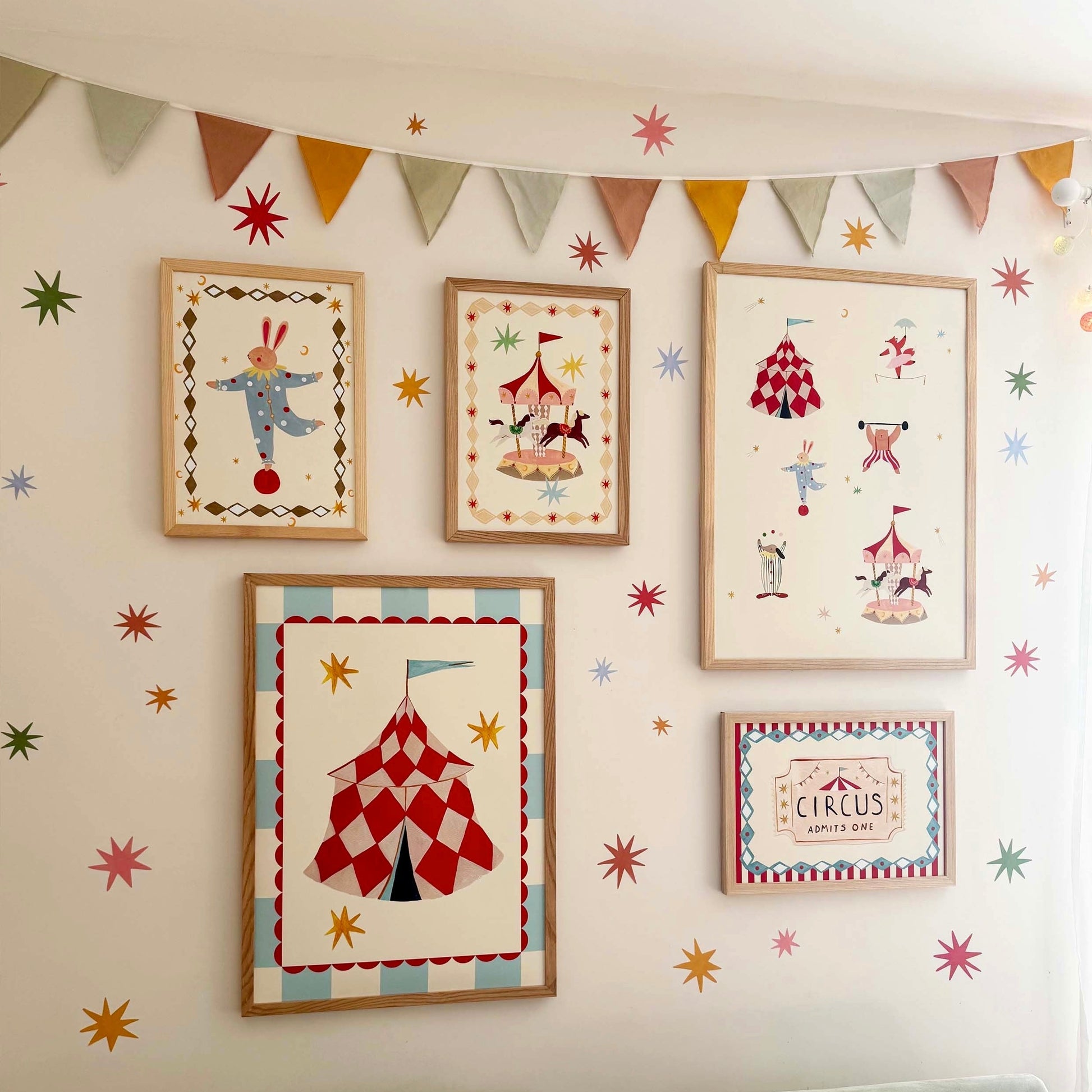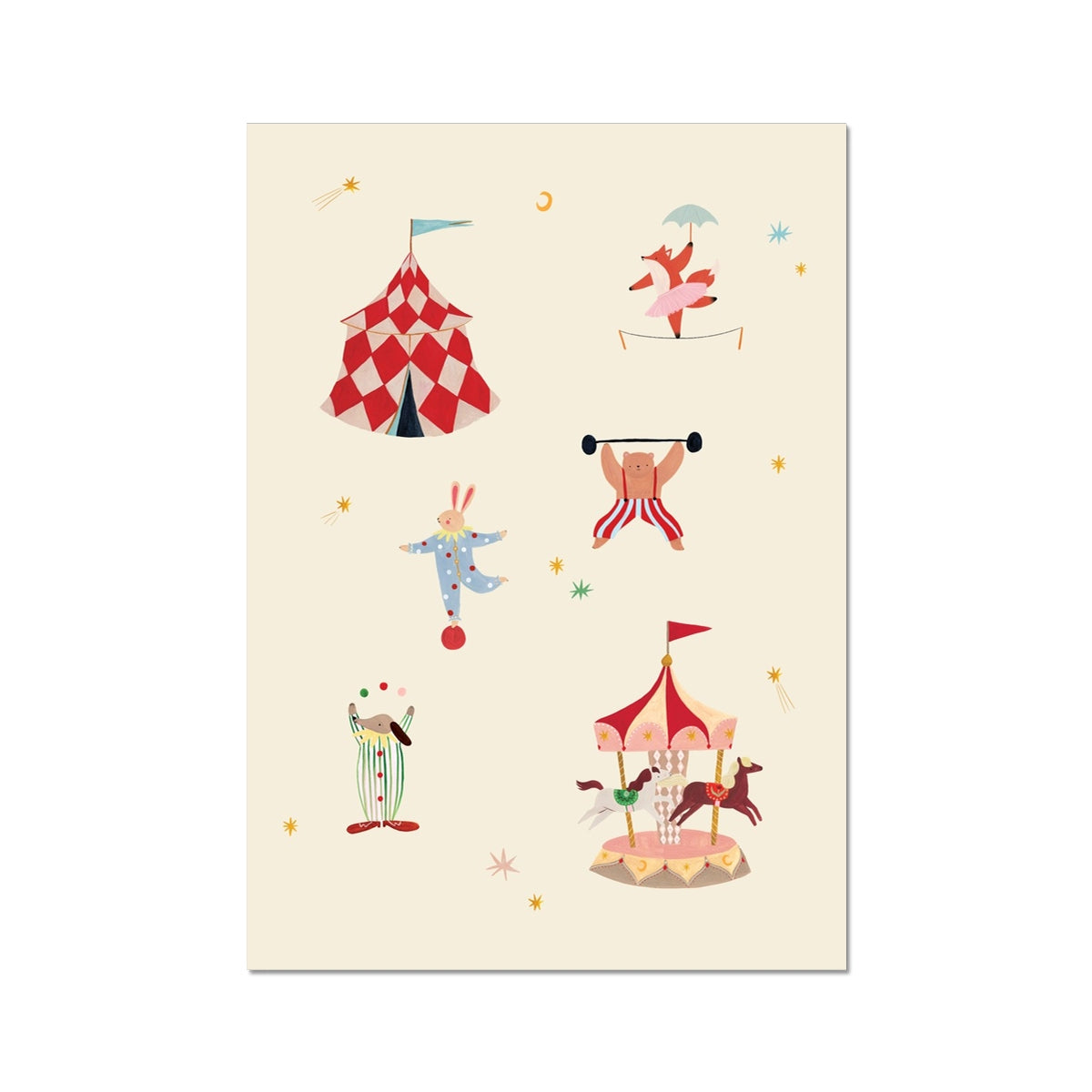 Step right into a world of wonder with A Day At The Circus fine art print by Kid of the Village. This joyful artwork features beautiful circus-inspired illustrations, including a balancing rabbit, carousel, weight-lifting bear, and more, all coming together to create a lively and magical scene full of movement and imagination.