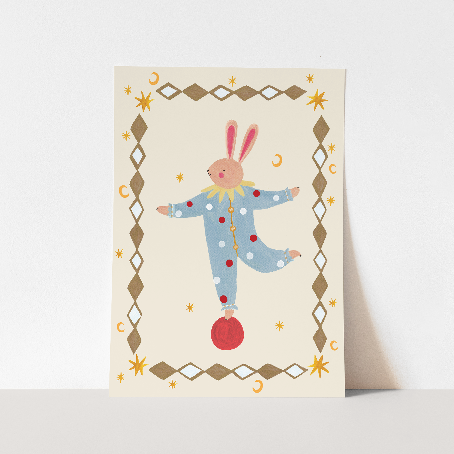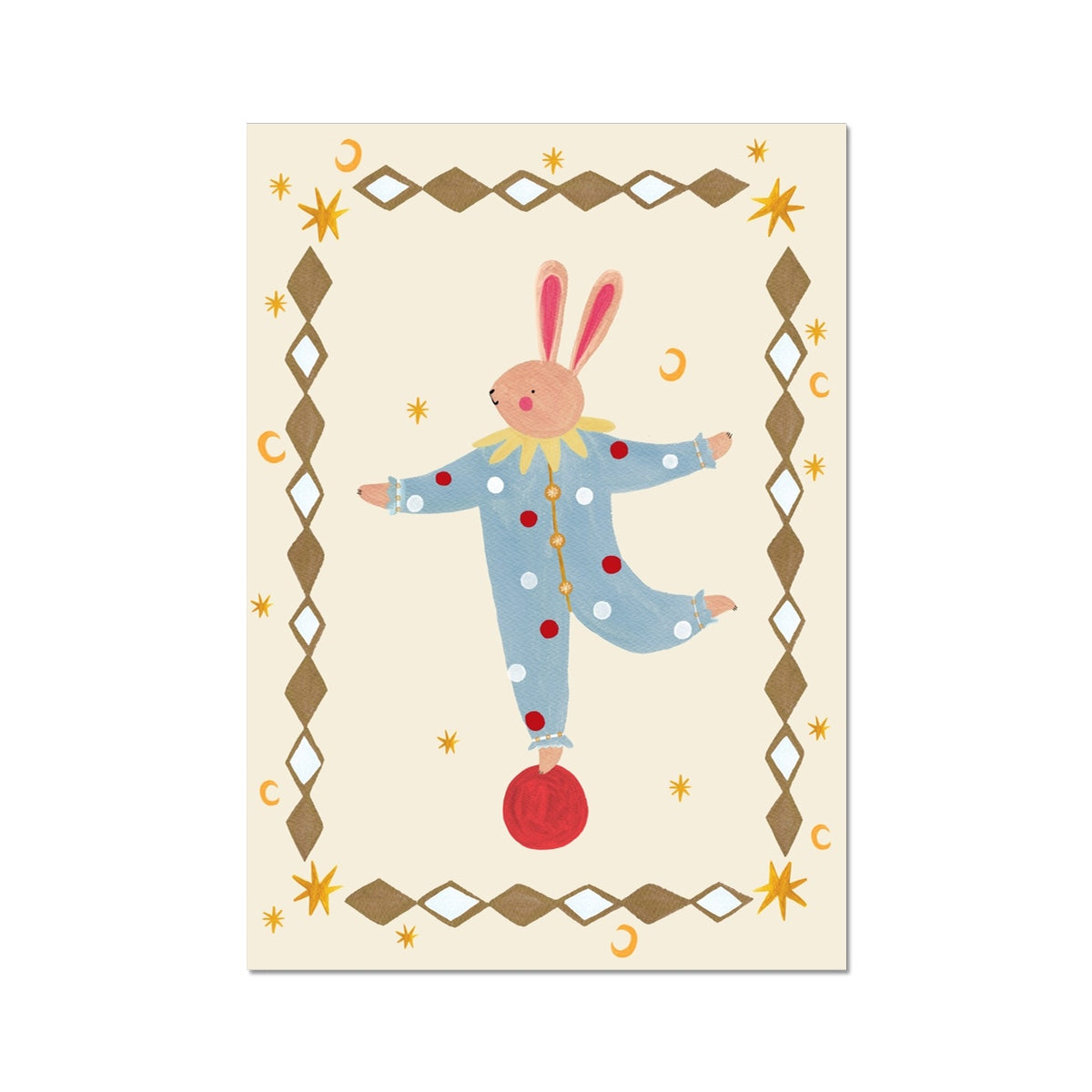 Bring a sense of gentle charm and playful imagination to your space with the Balancing Bunny fine art print by Kid of the Village. This delightful artwork features a balancing bunny illustration with a decorative border, creating a whimsical yet timeless design that’s perfect for little ones spaces and beyond.