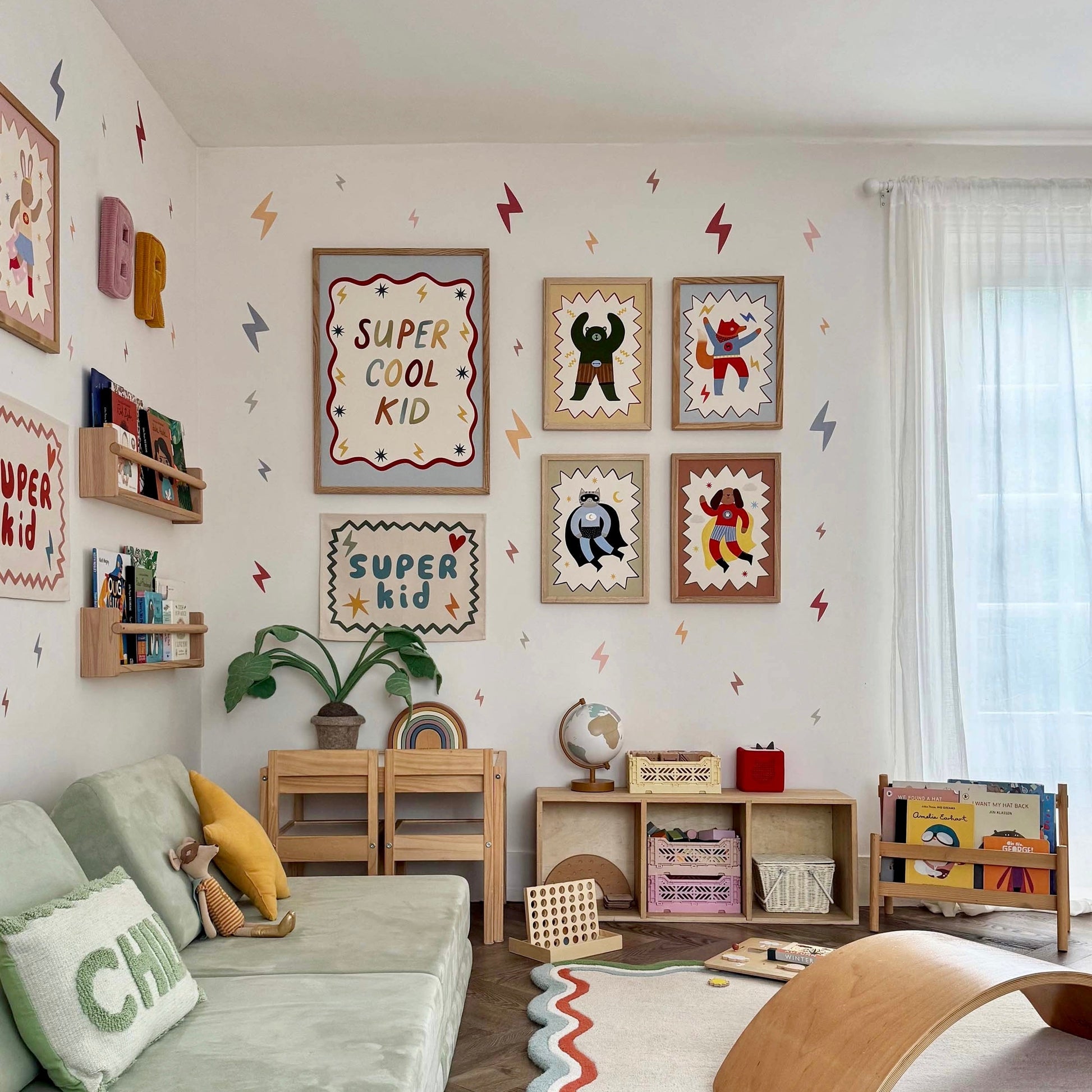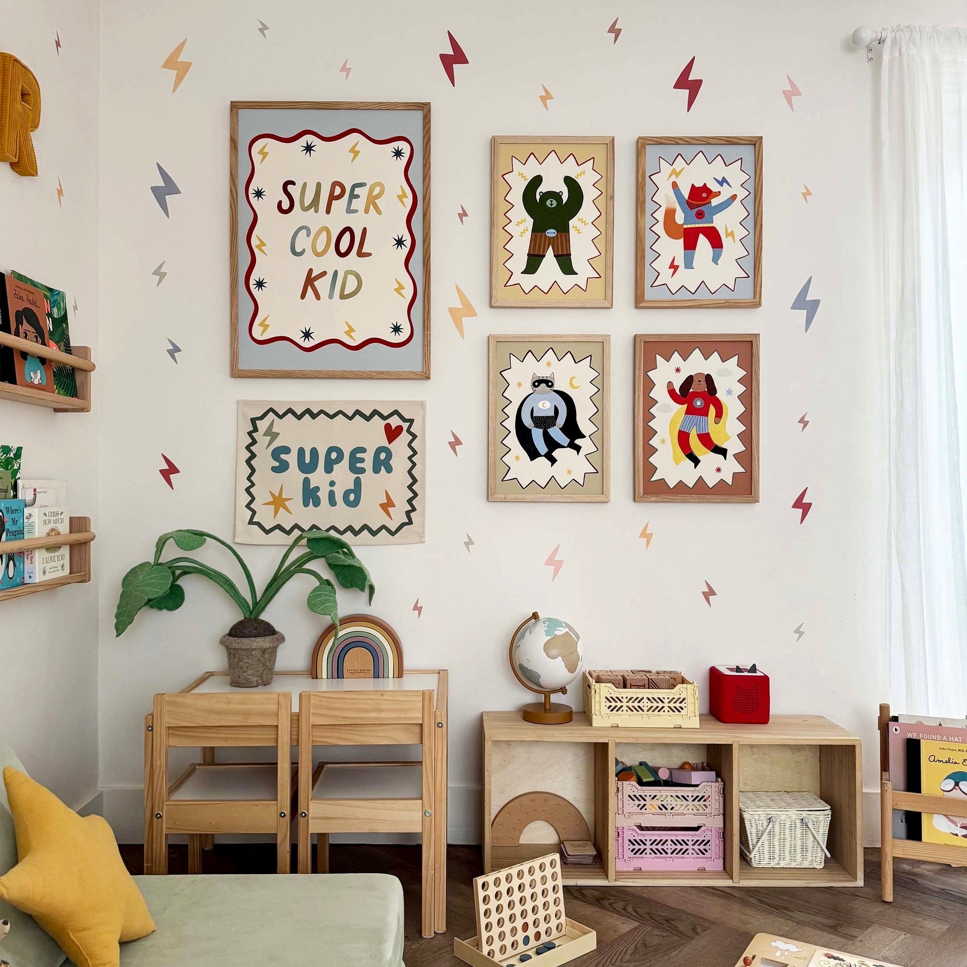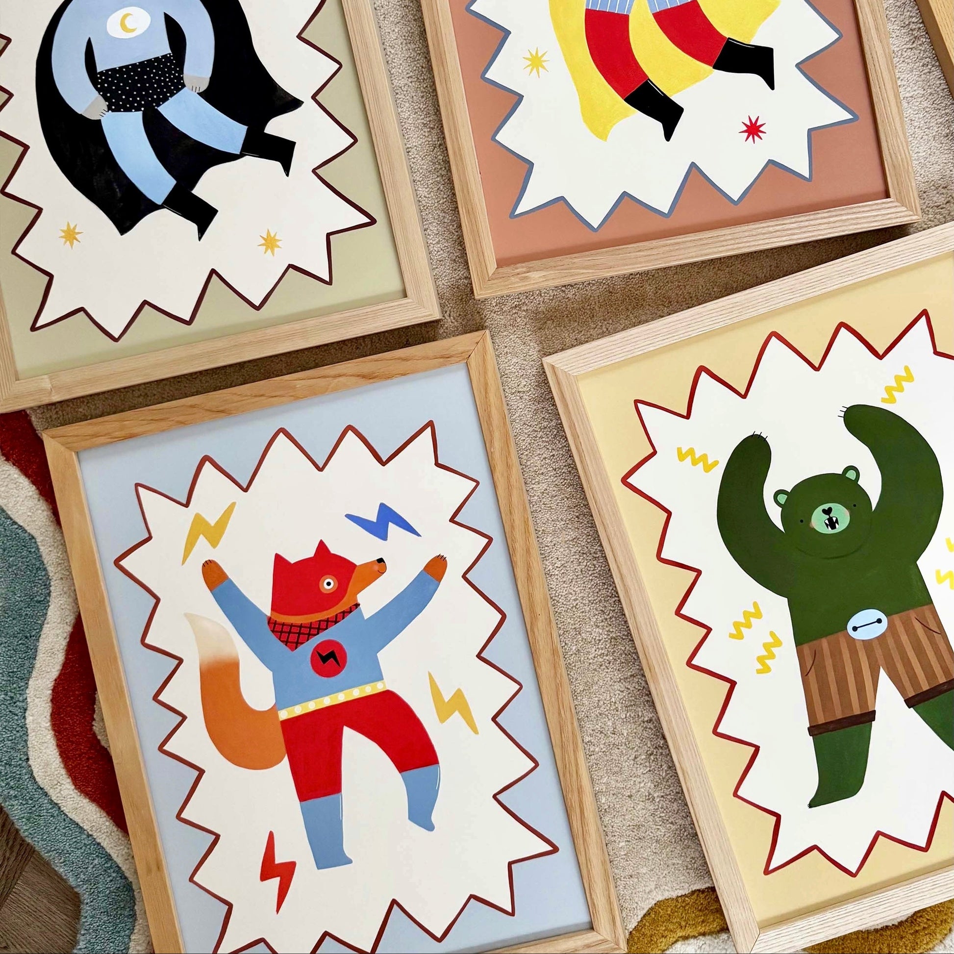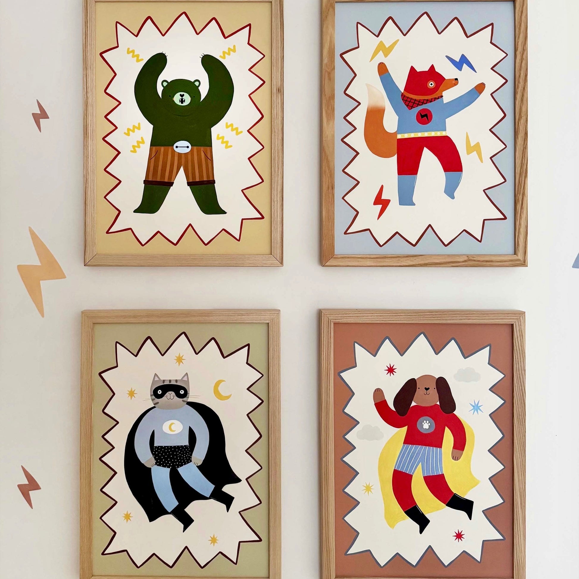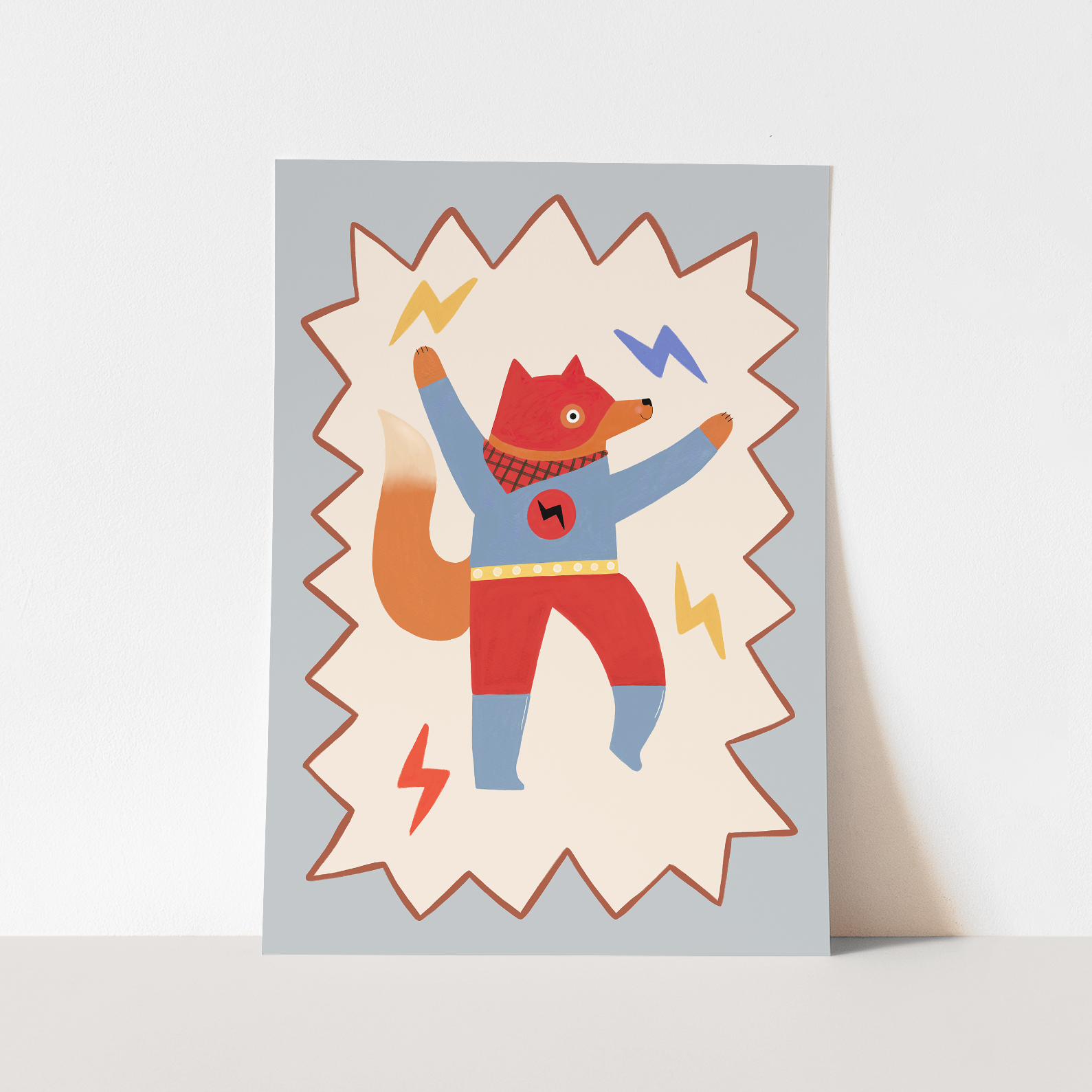 Bring high-energy hero vibes to your little ones space with the Flash Tail Superhero fine art print by Kid of the Village. This dynamic artwork features a superhero fox set against a soft blue background, featuring a playful zig-zag border, creating a fun and adventurous design that sparks imagination.
