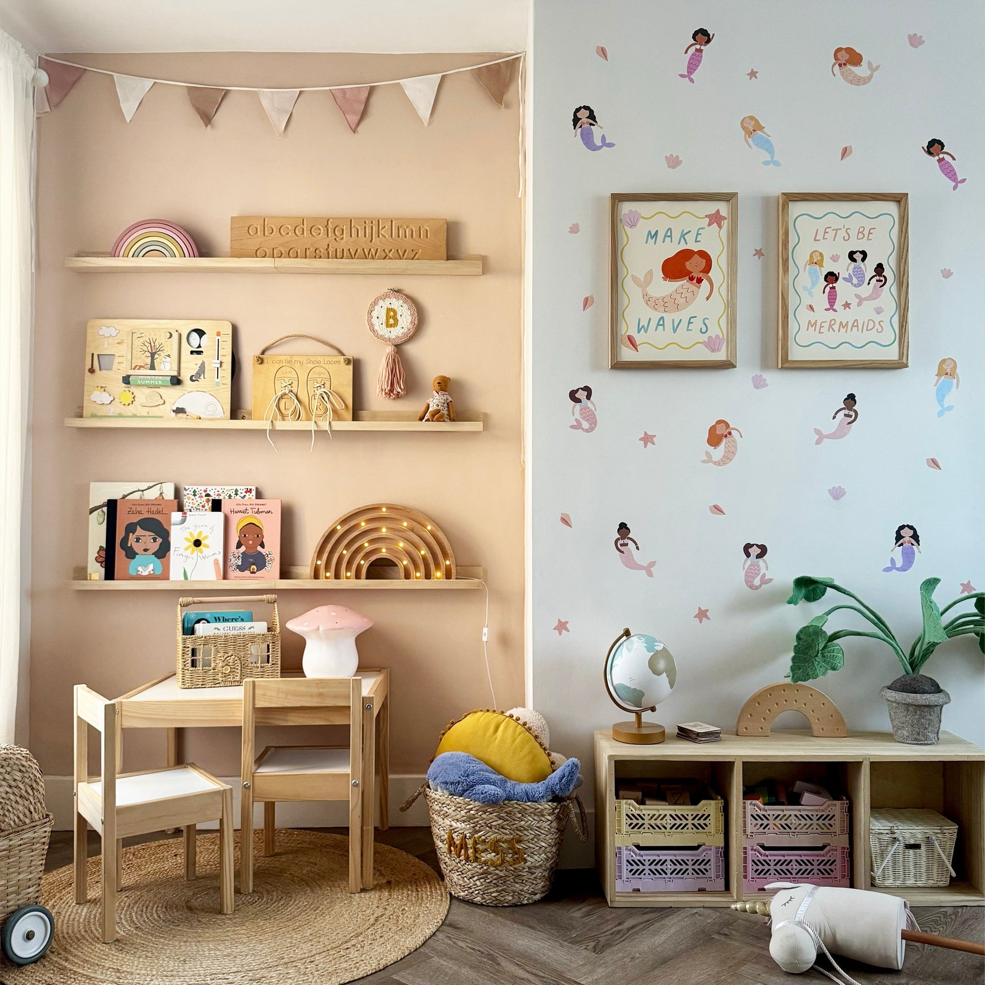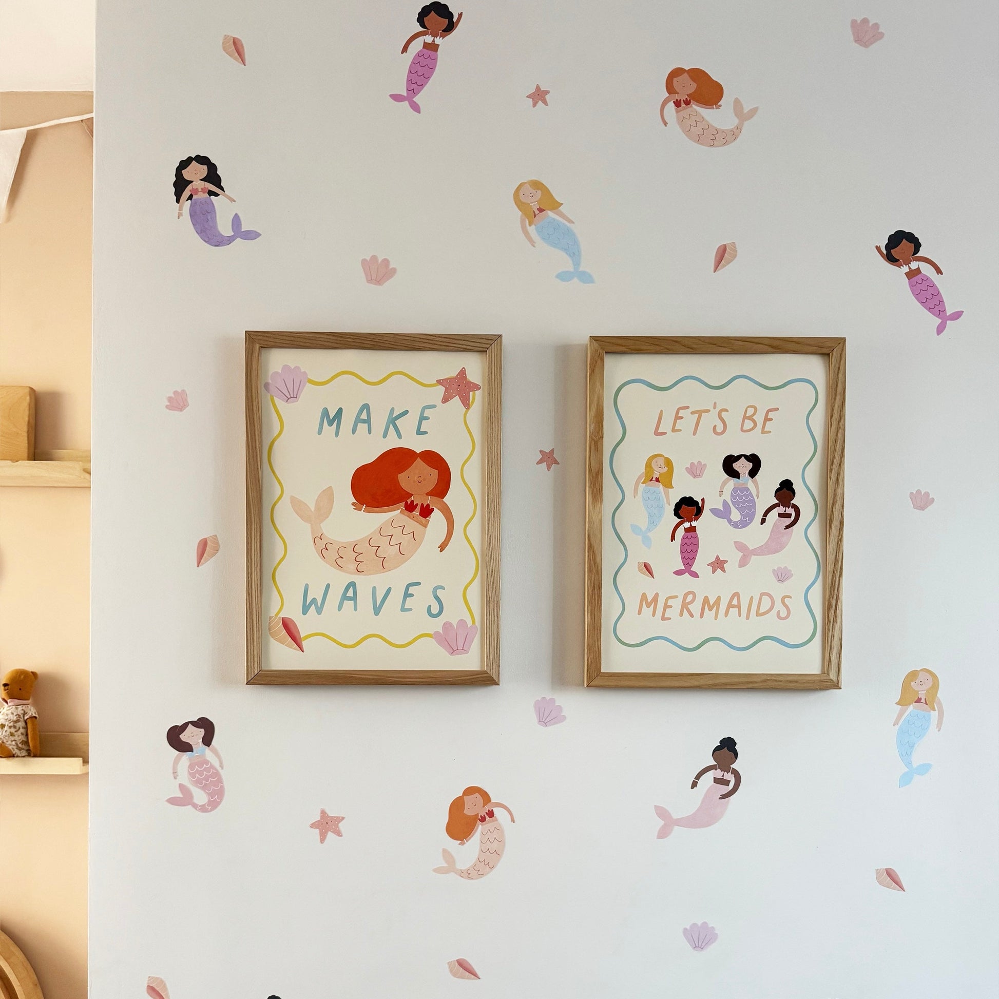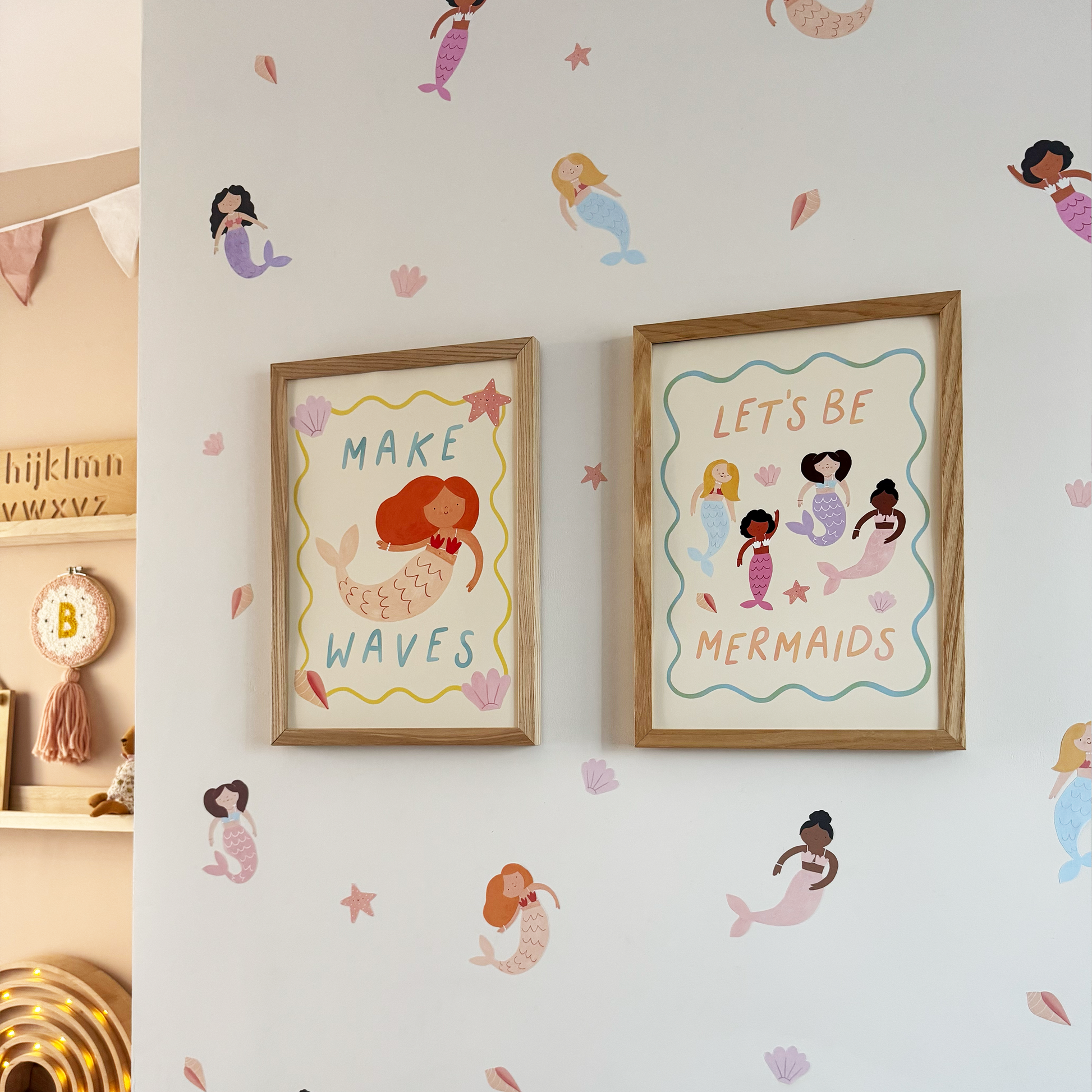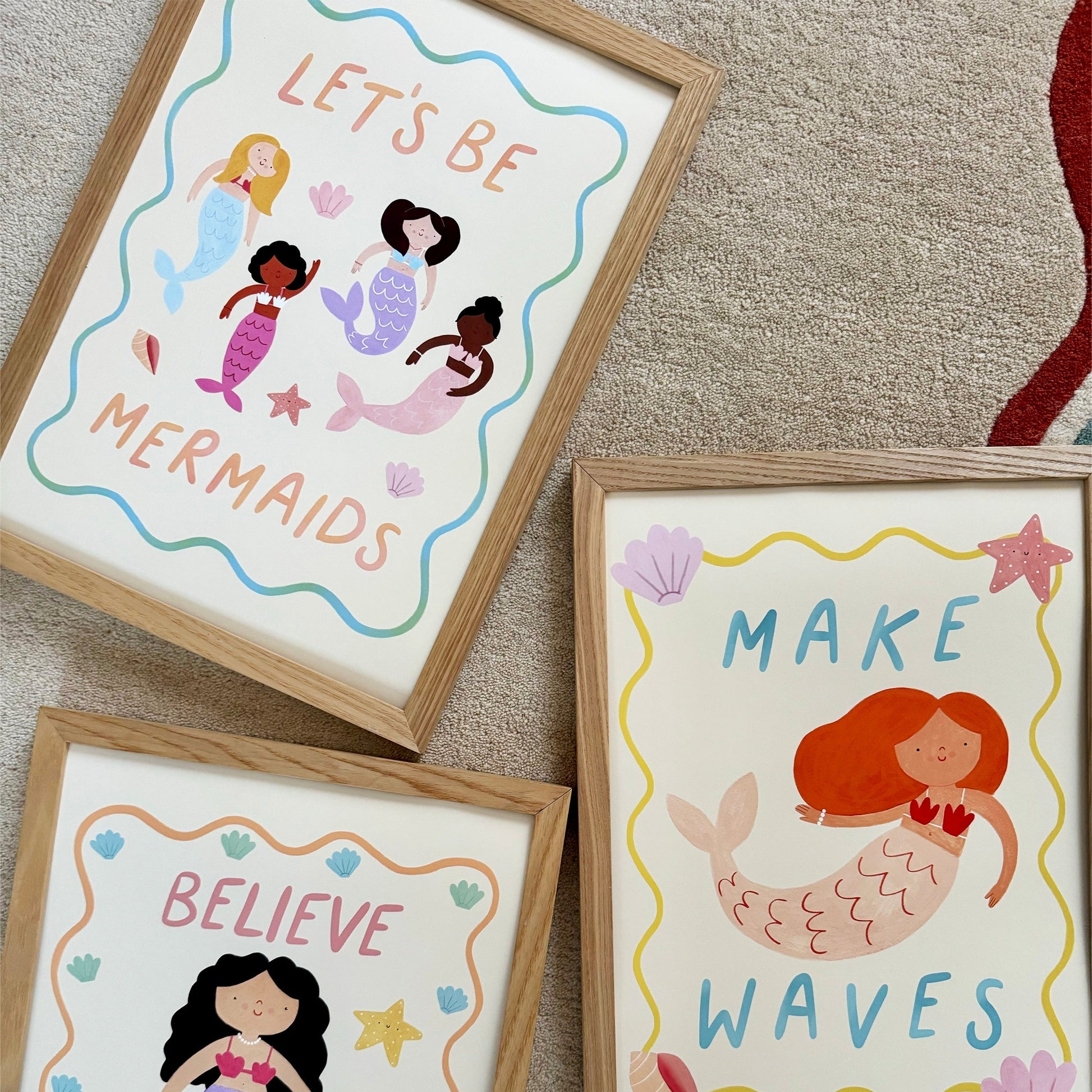 Celebrate imagination, friendship and a love of the sea with the Let’s Be Mermaids Fine Art Print by Kid of the Village. This joyful artwork features four beautifully illustrated mermaids, featuring a soft wavy blue border and finished with the playful wording “let’s be mermaids”.