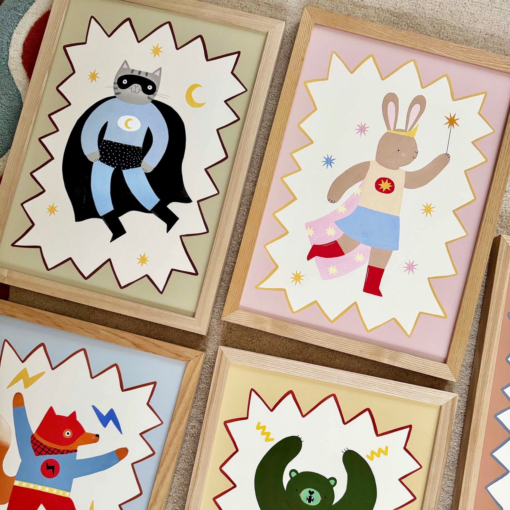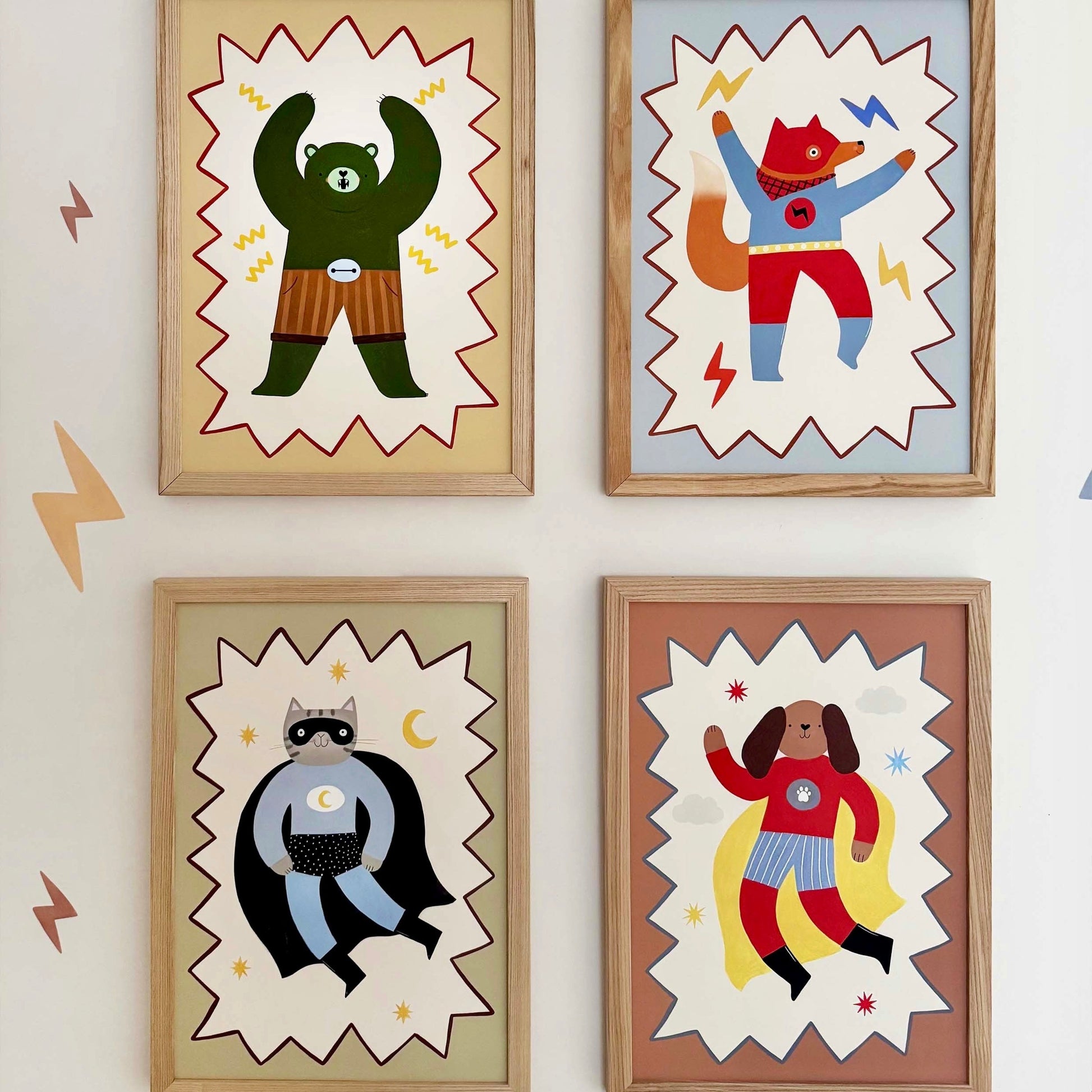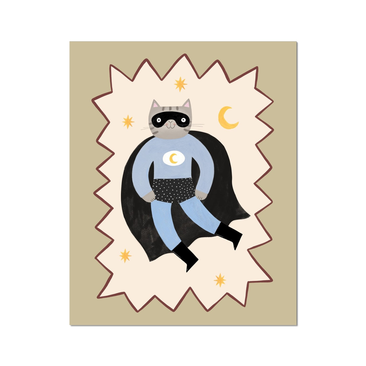Bring a bold sense of adventure to your little ones space with the Night Paw Superhero fine art print by Kid of the Village. This striking artwork features a cat superhero featuring a comic-style border, capturing the excitement and imagination of classic comic books with a playful, child-friendly twist.