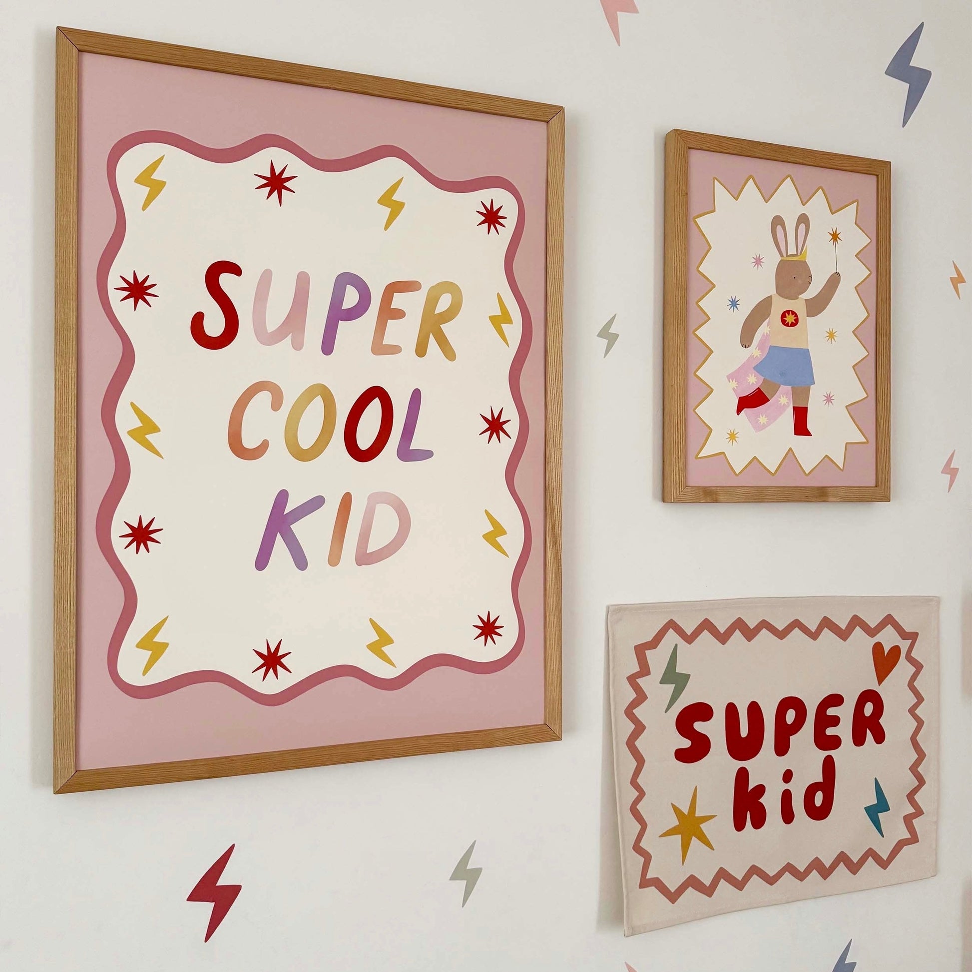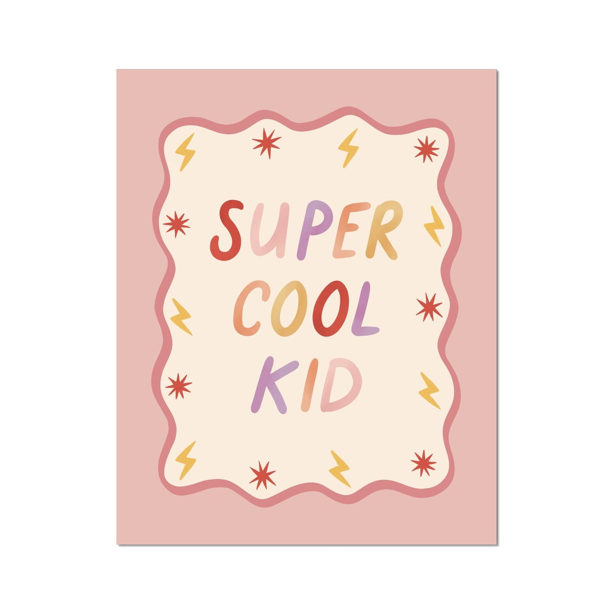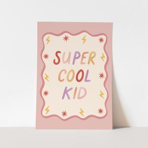 Celebrate creativity with the Super Cool Kid fine art print in Pink by Kid of the Village. Featuring a soft pink background, a wavy pink border, and central text reading “Super Cool Kid” in gentle multi-coloured tones, this uplifting design adds warmth, positivity, and personality to any little ones space.