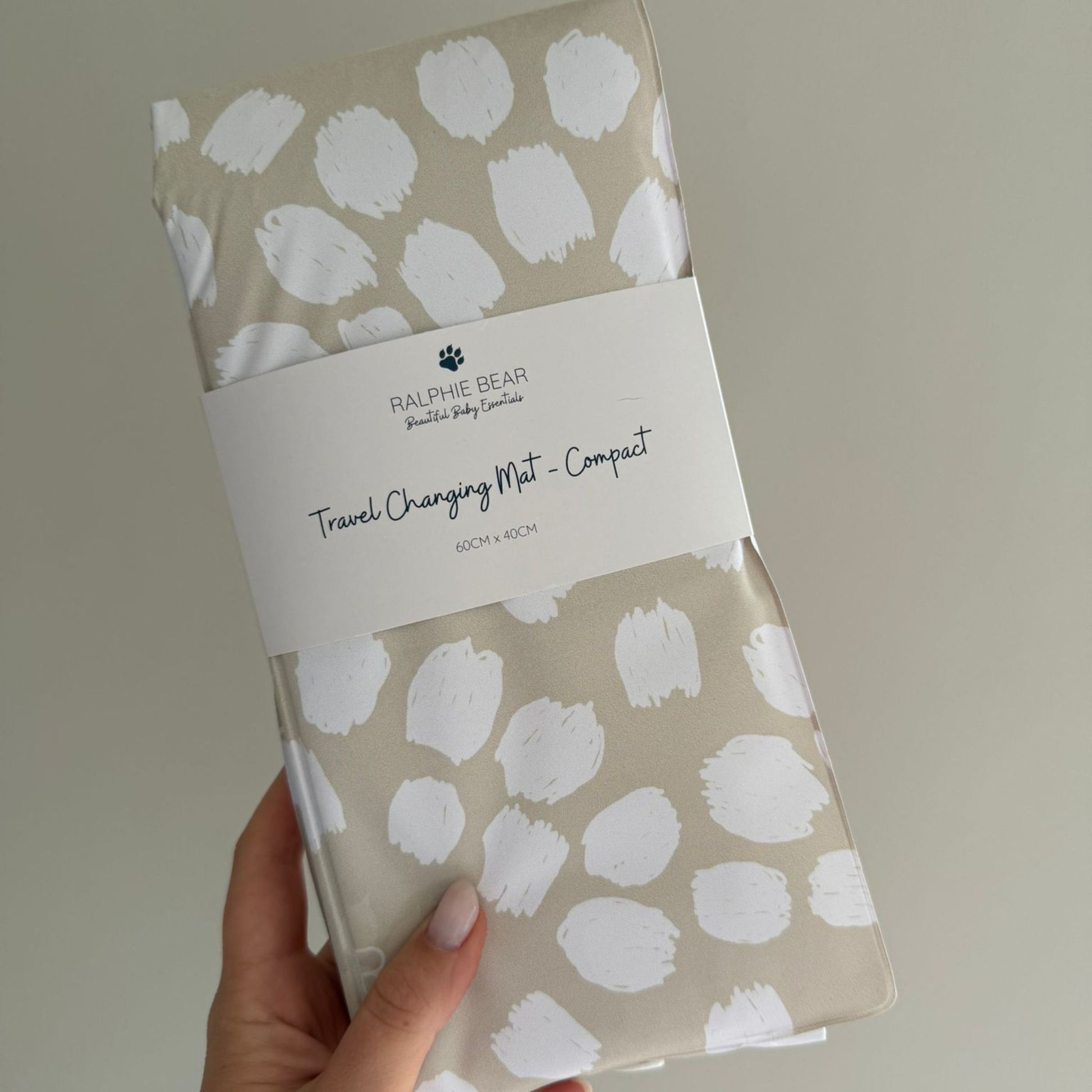 Designed to support your baby from birth through to toddler, the Ralphie Bear travel mat is a stylish staple for your changing bag. Featuring a neutral beige canvas with a delicate white, scallop-inspired print. Whether you're exploring the park, visiting loved ones, or heading off on a weekend adventure, this portable changing mat is the perfect blend of style, comfort, and convenience.