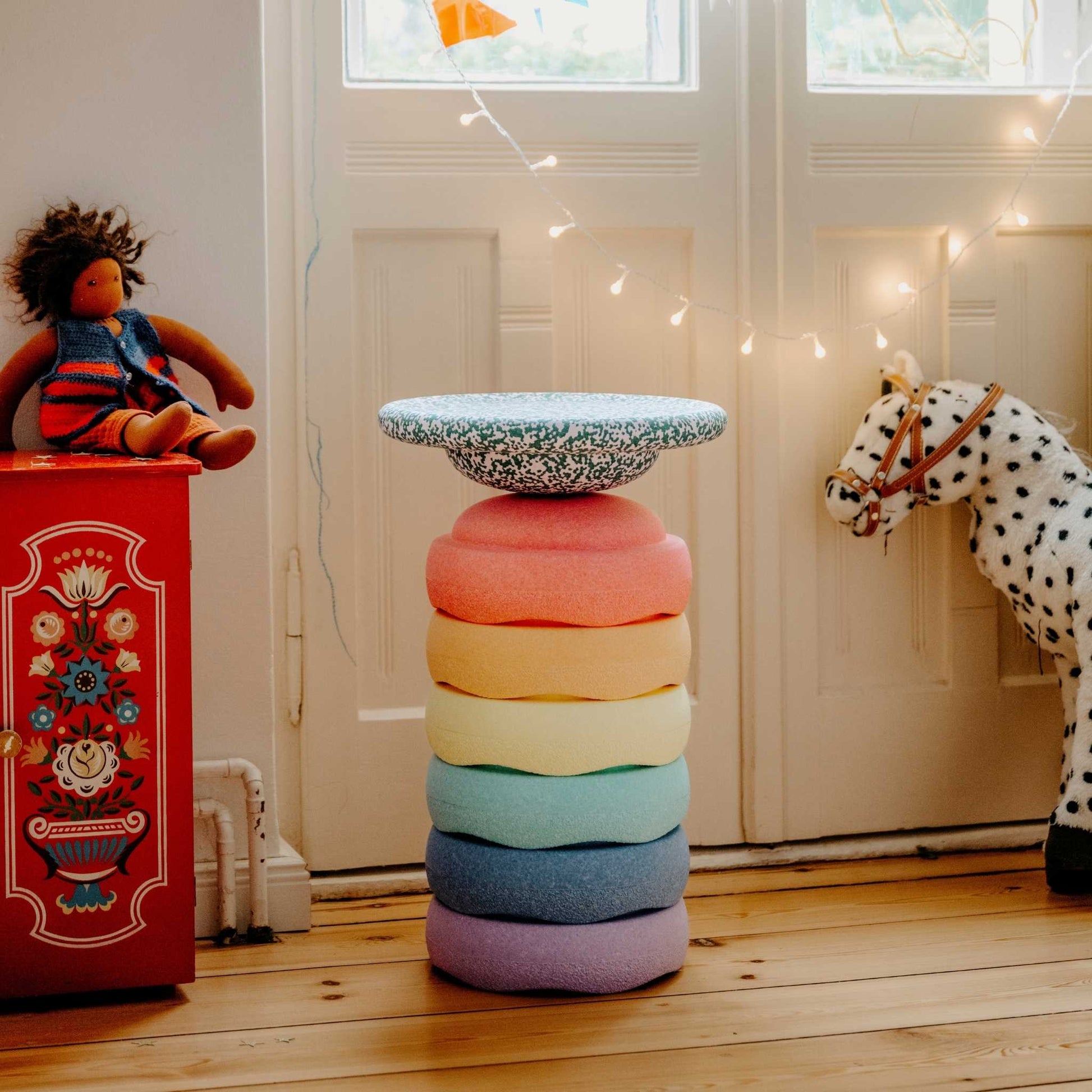 Introduce a touch of pastel to Christmas with this merry Stapelstein Stepping Stones 6+1 set. Complete with 6 stepping stones in pastel rainbow colours and 1 balance board in festive Dark Green & Blush, this is a fantastic open-ended play set.