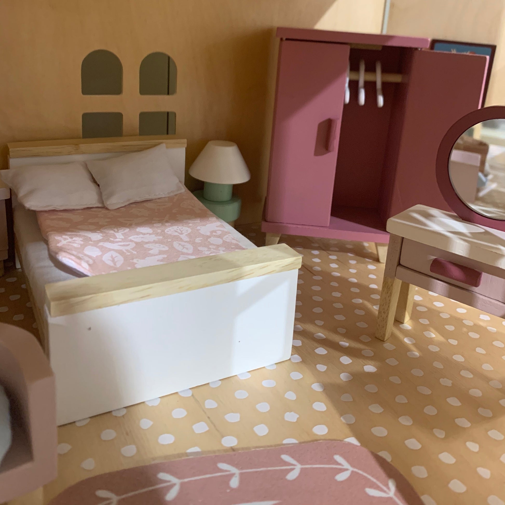 The most gorgeous bedroom set by Tender Leaf Toys. Painted in soft dusty pinks this room evokes the splendour of any designer bedroom. The rug, bedding and cushion have been printed with pretty illustrations making this set truly unique.
