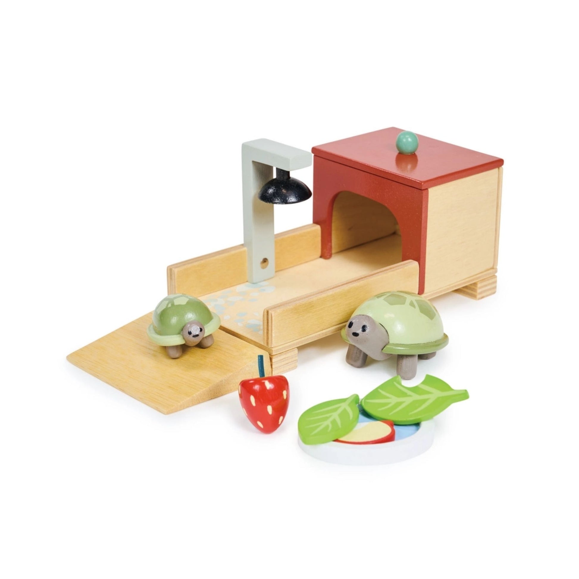 This Tortoise Pet Set from Tender Leaf Toys makes for an adorable exotic edition to your dolls house set up. The mama tortoise happily plods along, her baby in tow as they nibble on leaves and fruit, before heading to the water bowl for a drink. When they're reading for a rest, they can wander up the ramp together, getting warm under the heater lamp before tucking themselves neatly into their hut and snuggling up.