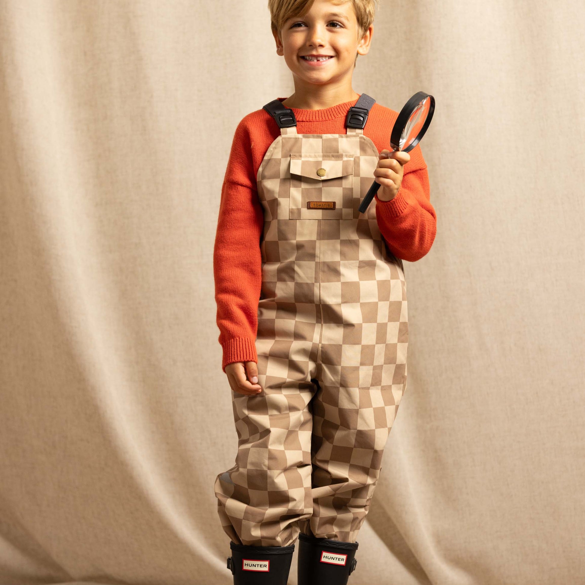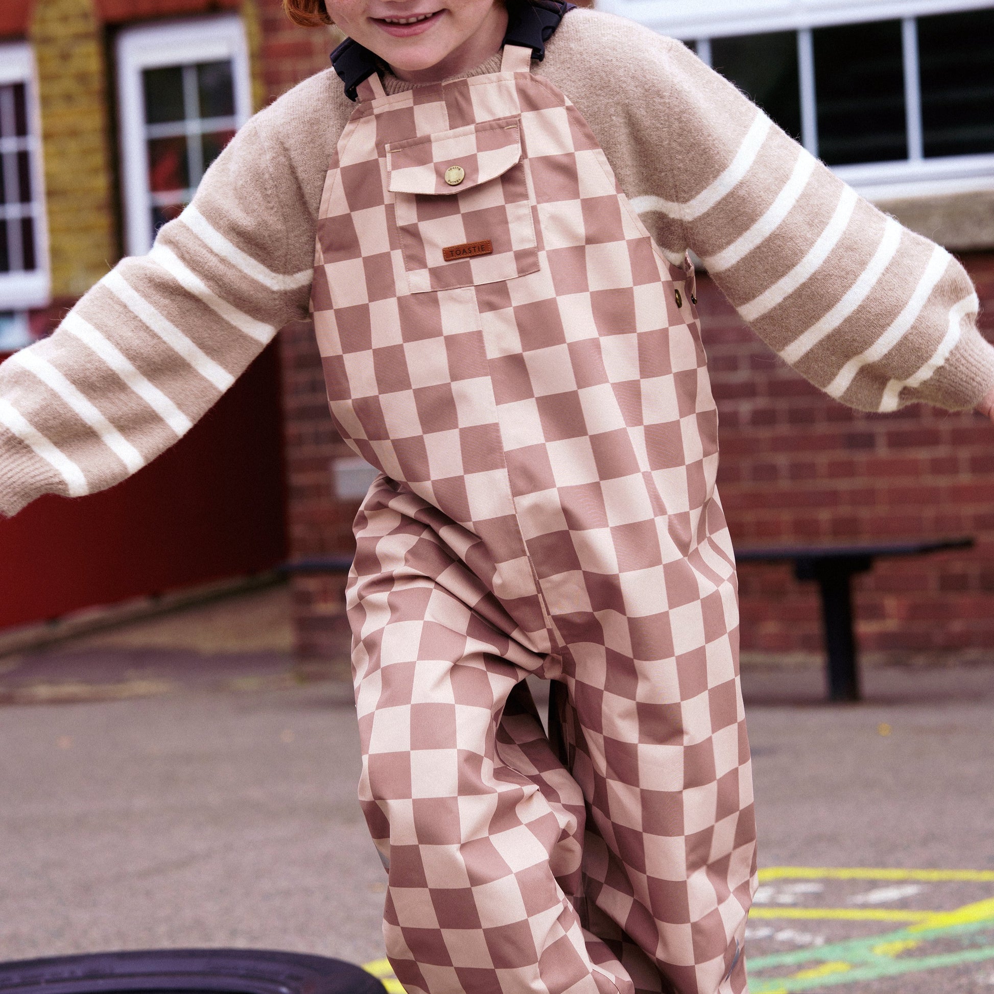 Keep your little one dry on a rainy day splashing in puddles with the Toastie All Season Waterproof Dungarees in print Caramel Checkerboard. Beautifully made, these sustainable and waterproof dungarees for kids are created from recycled plastic bottles.