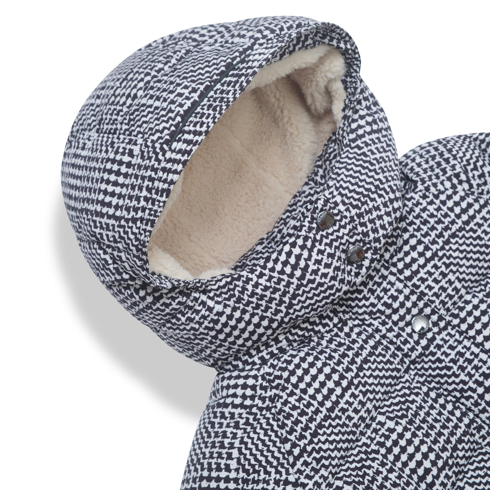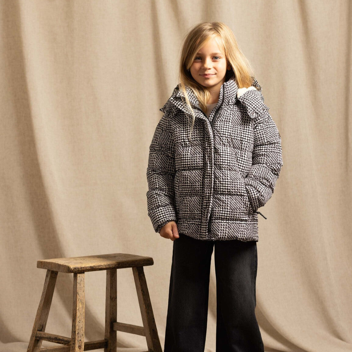 Finished in a fashionable black and white check pattern, it includes details like a climbing rope-inspired zip pull and an interior name label so it’s always easy to find. A go-to jacket for everyday winter wear.